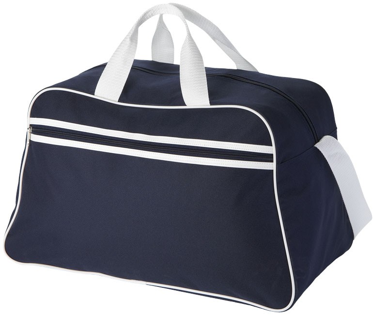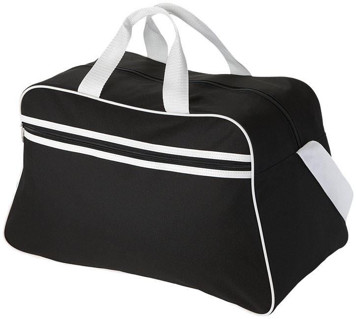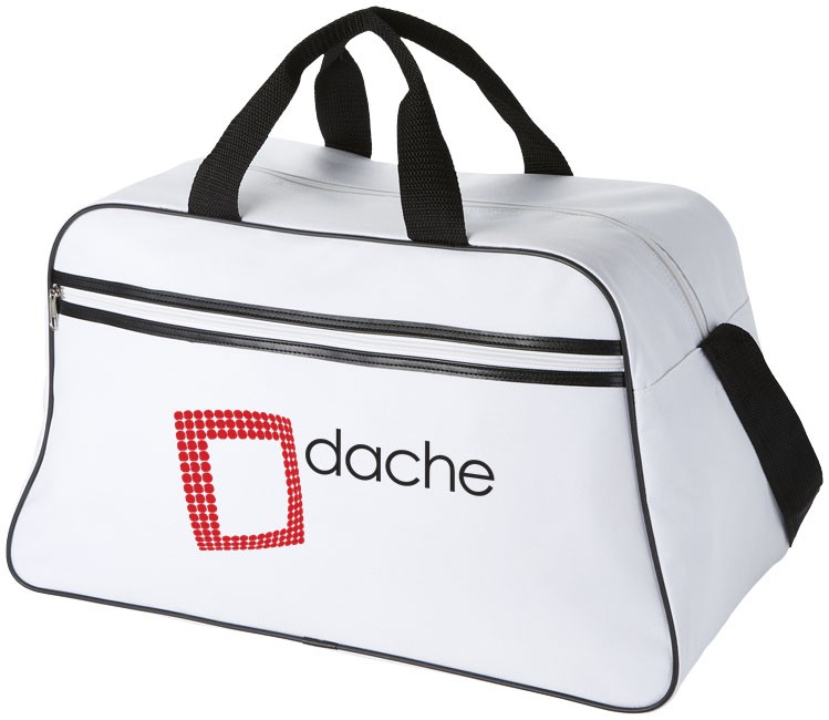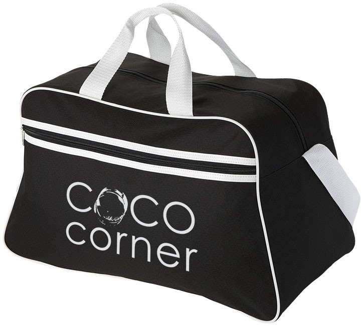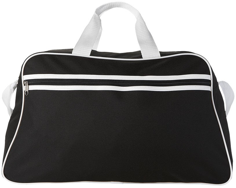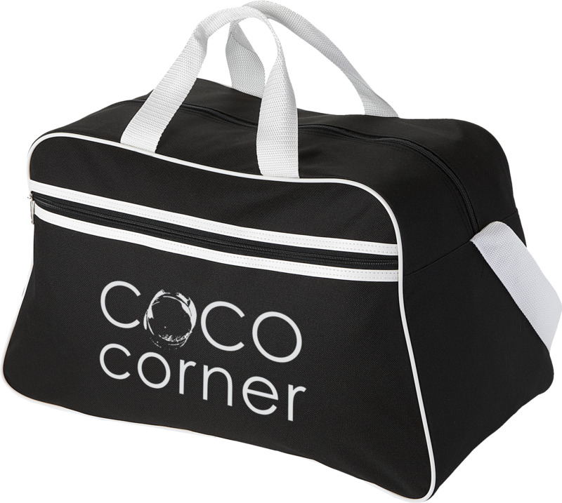 Sac de sport avec compartiment principal et poche frontale zippés. Polyester 600D. Fabriqué en Chine.