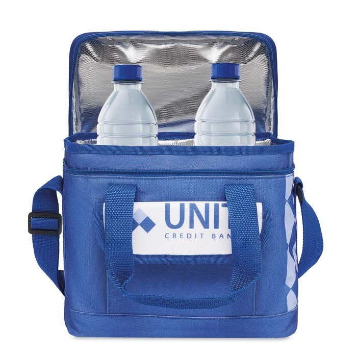 Sac à lunch et glacière de taille moyenne avec bandoulière. Polyester 600D avec mousse EPE 4mm et feuille d’aluminium. Les tissus blancs sont sublimés dans votre couleur. Fabriqué en Chine. Marquage sublimation sur toute la surface et frais techniques inclus.