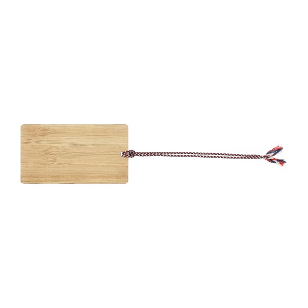Etiquettes à bagages en bambou ép. 3mm. avec intercalaire en polypro 0.03 cm. Fiche coordonnées gravée au verso à remplir. Jolie ficelle tricolore fabriquée en France de 30 cm. Un marquage quadri numérique 1 face inclus (hors frais techniques)