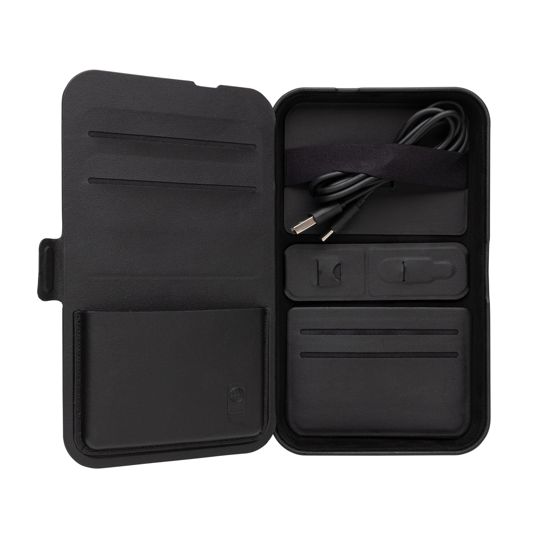 Étui de voyage à coque rigide avec chargeur sans fil 3-en-1 intégré, fabriqué en PU recyclé RCS Contenu recyclé total :5 % sur la base du poids total de l’article.La certification RCS garantit une chaîne d’approvisionnement entièrement certifiée pour les matériaux recyclés. L’étui est équipé d’un chargeur sans fil magnétique de 15 W et d’un chargeur sans fil supplémentaire de 5 W adapté aux boîtiers d’écouteurs ou à d’autres petits appareils rechargeables sans fil, ainsi que d’un chargeur sans fil de 2,5 W pour les smartwatches (montres Apple uniquement). Parfait pour transporter tous vos objets de valeur et recharger tous vos appareils. À l’intérieur se trouve également un petit portefeuille magnétique qui peut être retiré. Câble TPE de 120 cm inclus. Emballé dans un emballage FSC® mix. Article et accessoires 100% sans PVC. Entrée minimale : 9V/3A pour une utilisation optimale. Sortie : Téléphone : 9V/1.1A ; 9V/1.67 A/(15W), Ecouteurs : 5V/1A (5W), Montre : 5V/0.5A. Fabriqué en Chine avec empreinte carbone de 2.19kg equivalent CO².