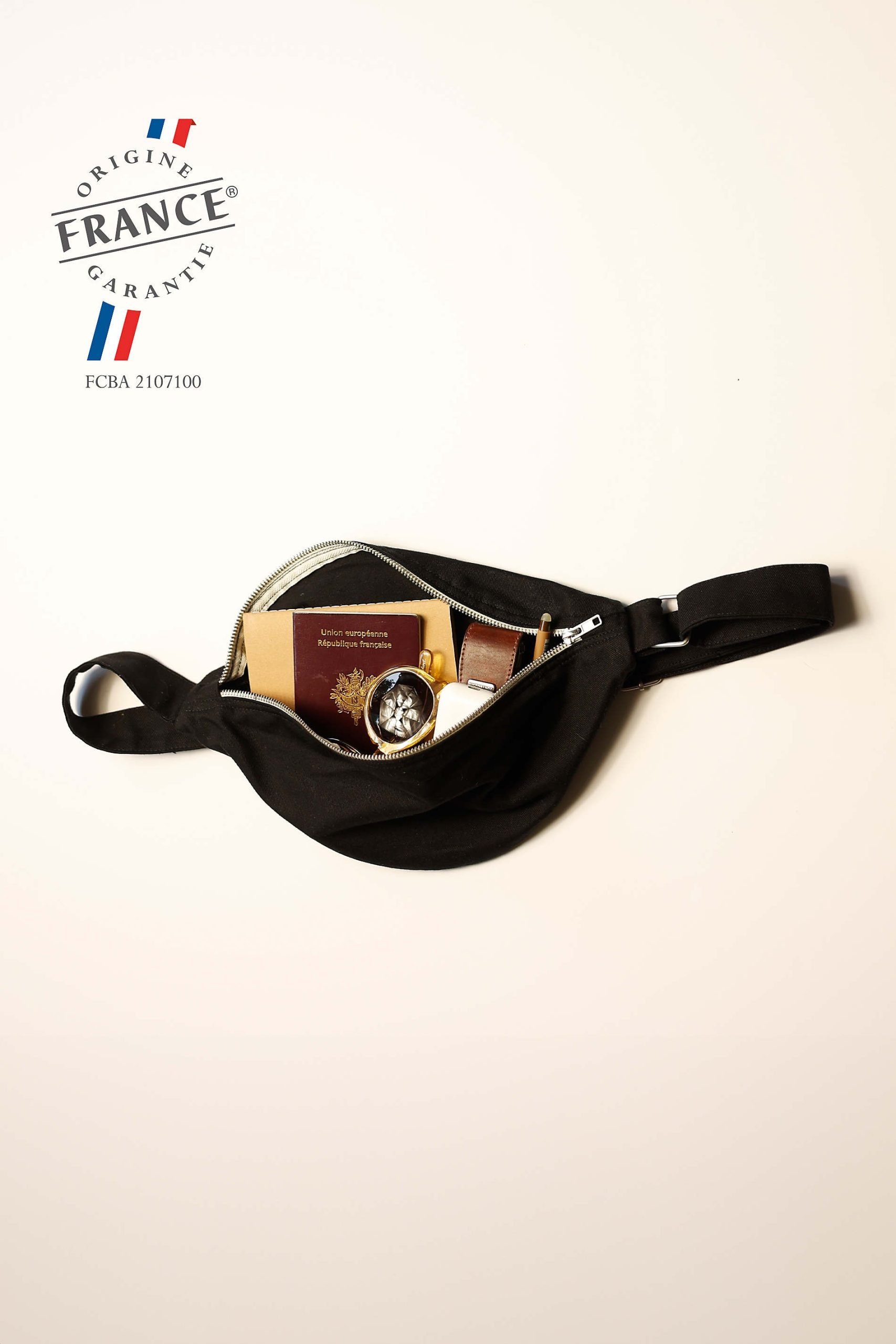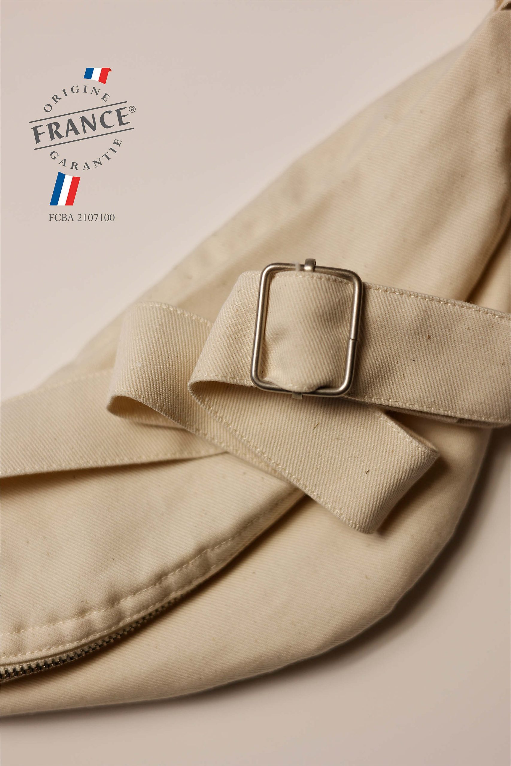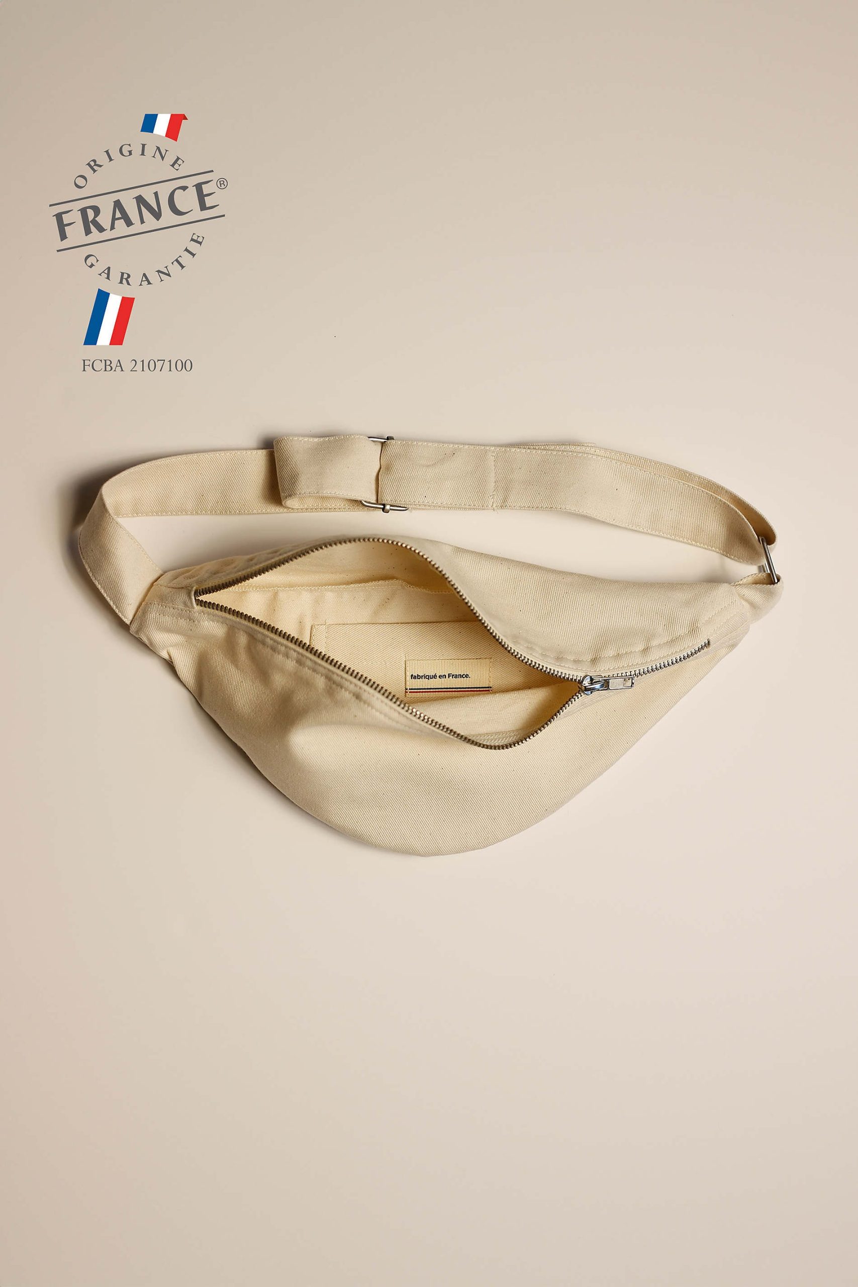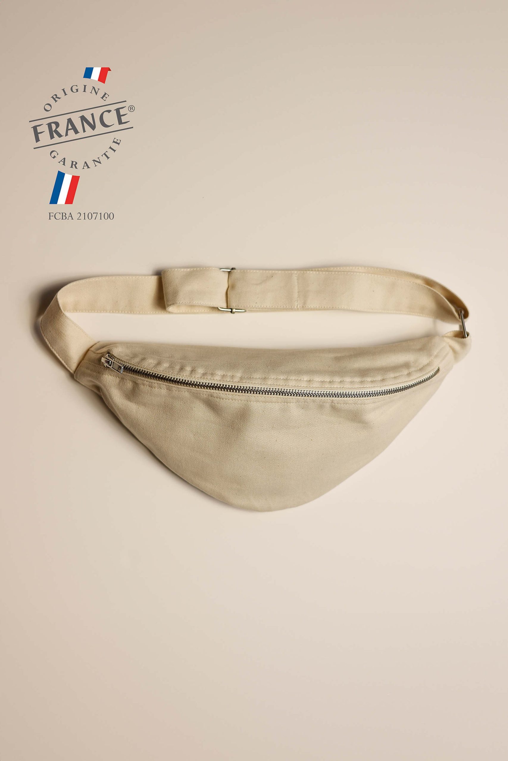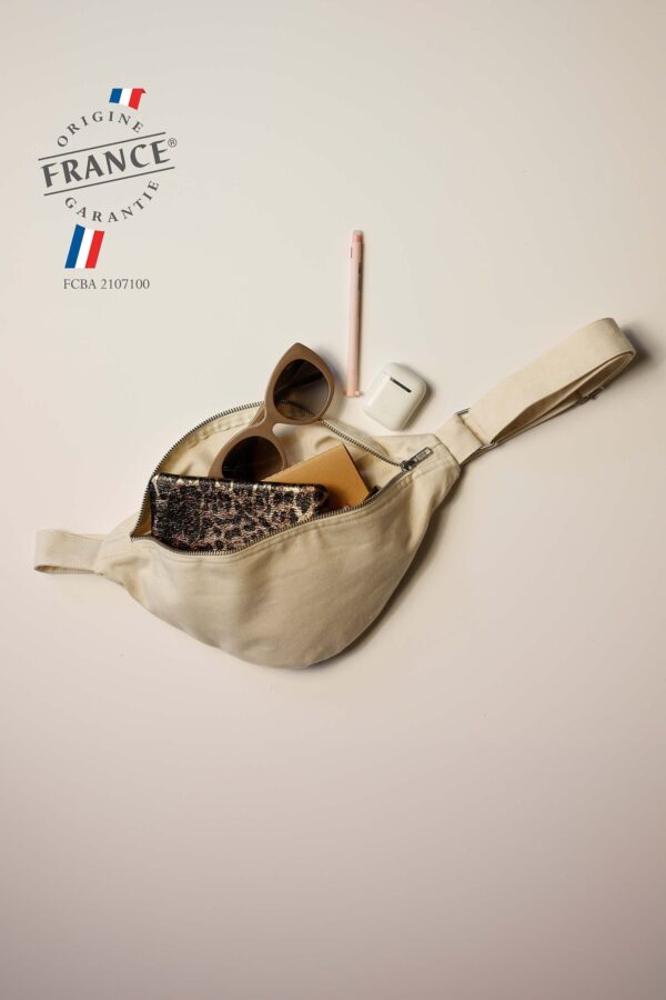 Sac banane avec fermeture éclair en métal et tir-zip, tissé et fabriqué en France – 50% coton recyclé – 50% coton. Tissus sanforisé pour une meilleure résistance. Nous préconisons de laver notre produit avant première utilisation. Bandoulière double épaisseur avec coutures renforcées et boucles de réglage en métal. Poche intérieure avec étiquette gros grain « Fabriqué en France ».