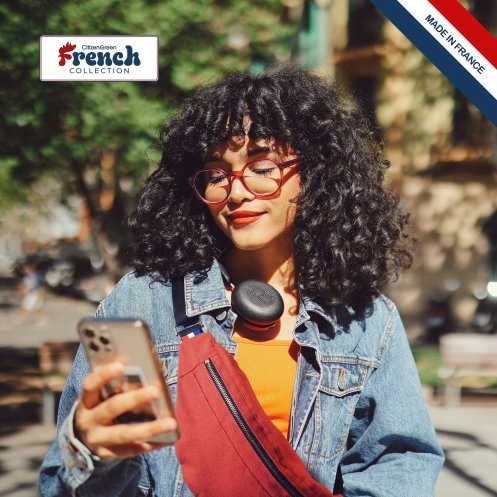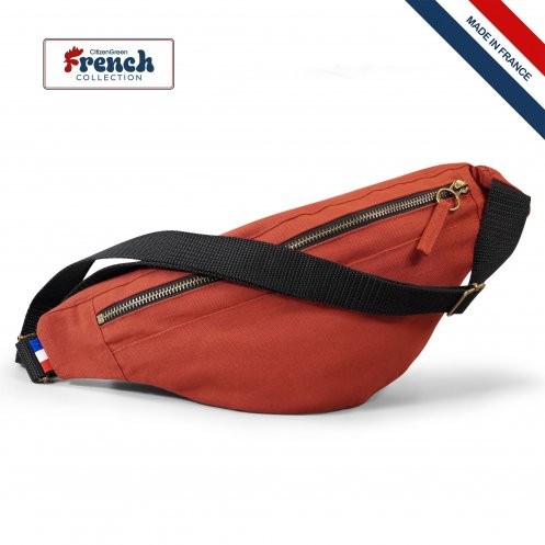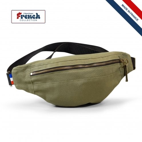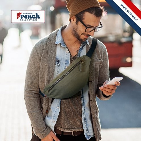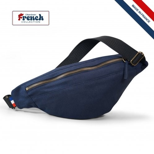 Sac banane avec fermeture zippée en 100% coton 220g/m² et sangle ajustable noire en polypropylène. Fabriqué en France avec puce Bleu/Blanc/Rouge. Empreinte carbone de 0.67kg equivalent CO².