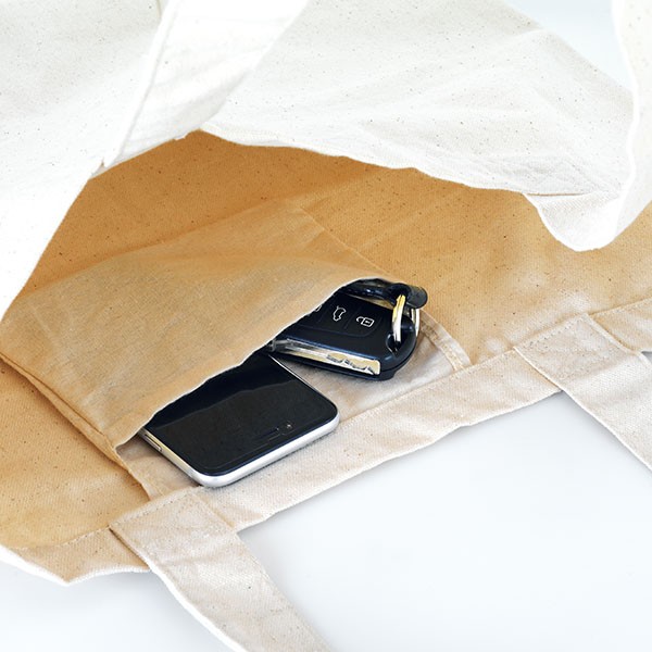 Sac 100% coton canevas 280 g/m² avec poche intérieur et anses de 65 cm. Produit fabriqué selon une norme certifiée pour l’utilisation de substances nocives dans le textile. Fabriqué en Inde.