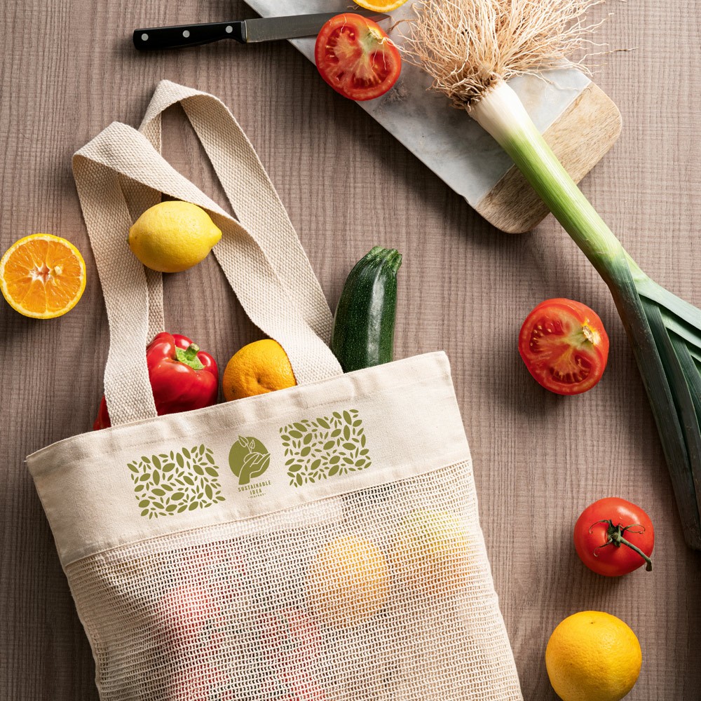 Sac 100% coton 180 g/m² avec maille 100% coton sur le devant. Anses en webbing de 65cm. Sac idéal pour les courses.