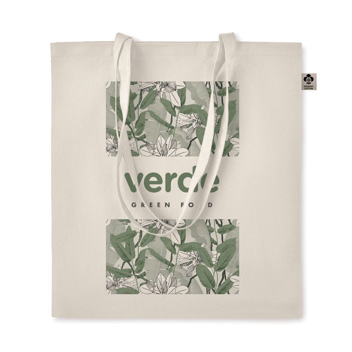 Sac shopping en coton biologique certifié à anses longues . Un tote bag classique conçu pour transporter vos courses quotidiennes ou d’autres articles. Portez le sac dans vos mains ou sur votre épaule grâce aux longues poignées. Fabriqué en coton biologique 100% naturel 140 gr/m².