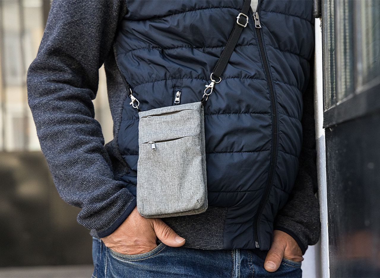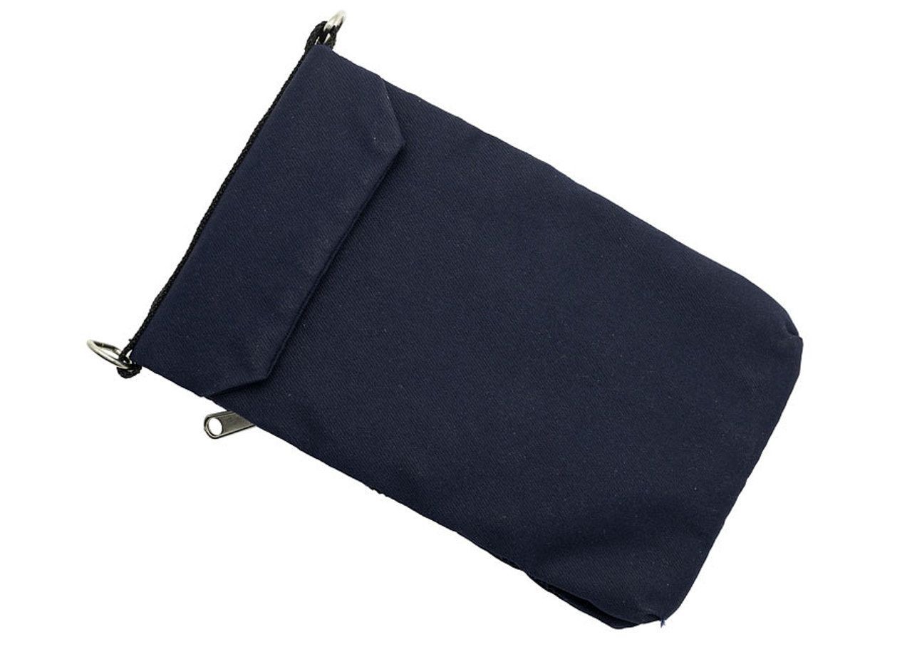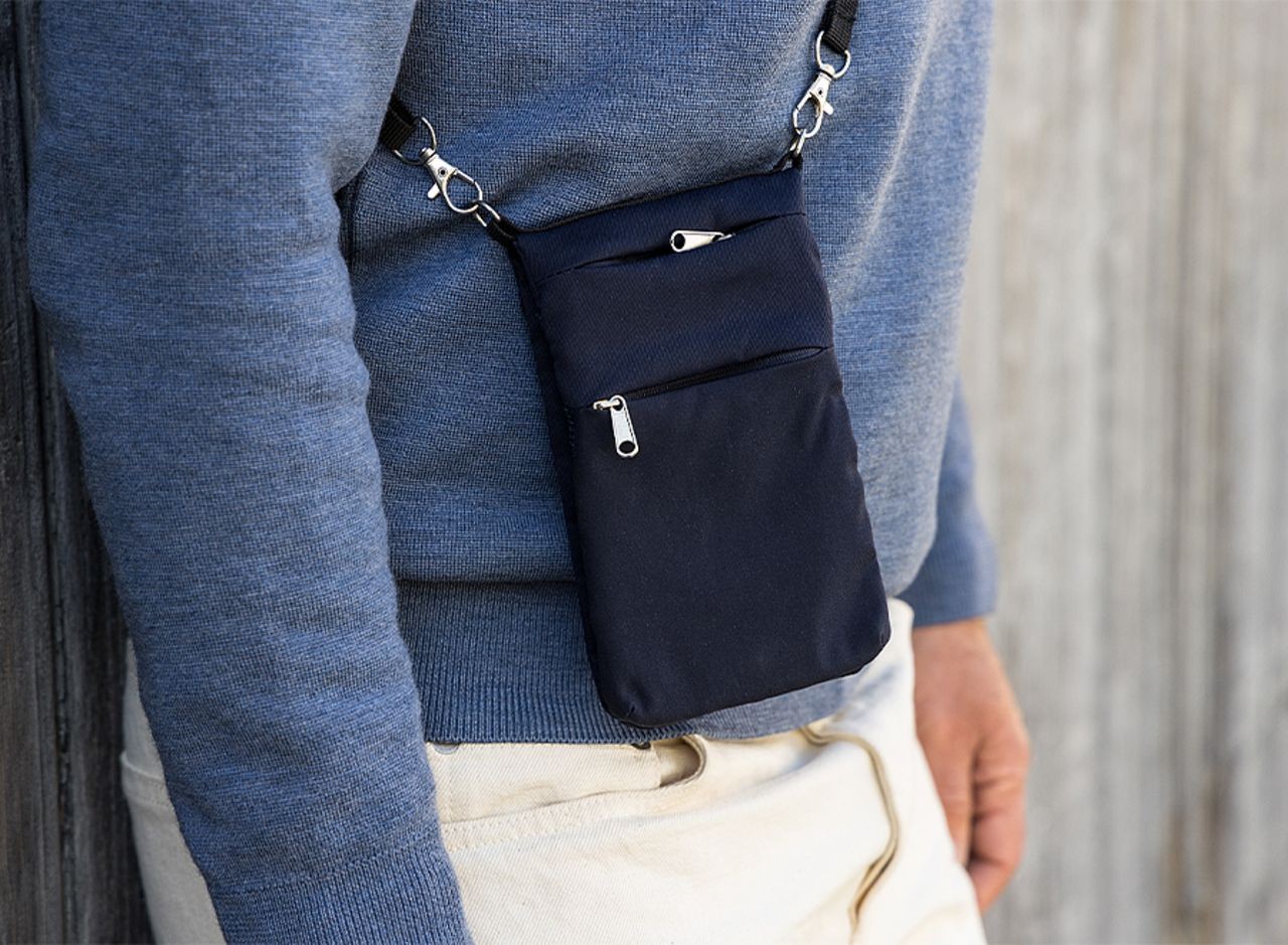 Pochette en polycoton 160g/m². 4 espaces de rangement avec fermeture zippée dont l’un en maille permettant de voir directement le contenu. 2 espaces complémentaires dont l’un sur l’extérieur prévu pour accueillir un smartphone. Rabat maintenu par un bouton pression. Intérieurs entièrement doublés. Bandoulière en nylon. Utilisation du polycoton réputé pour sa grande résistance dans le temps, sa facilité d’entretien et sa capacité à peu se froisser. Espace de rangement extérieur universel adapté à tous types de smartphones. Un grand nombre de rangements différents dans une pochette ultra-compacte. Fabriqué en Chine.