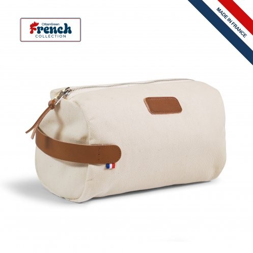 Trousse à fermeture zippée 100% Twill de coton biologique 360g/m² et attributs cuir espèce bovine. Petite poche intérieure et 1 poignée cuir 2,2 x 21cm. Fabriqué en France avec puce Bleu/Blanc/Rouge. Empreinte carbone de 1.17kg équivalent CO².