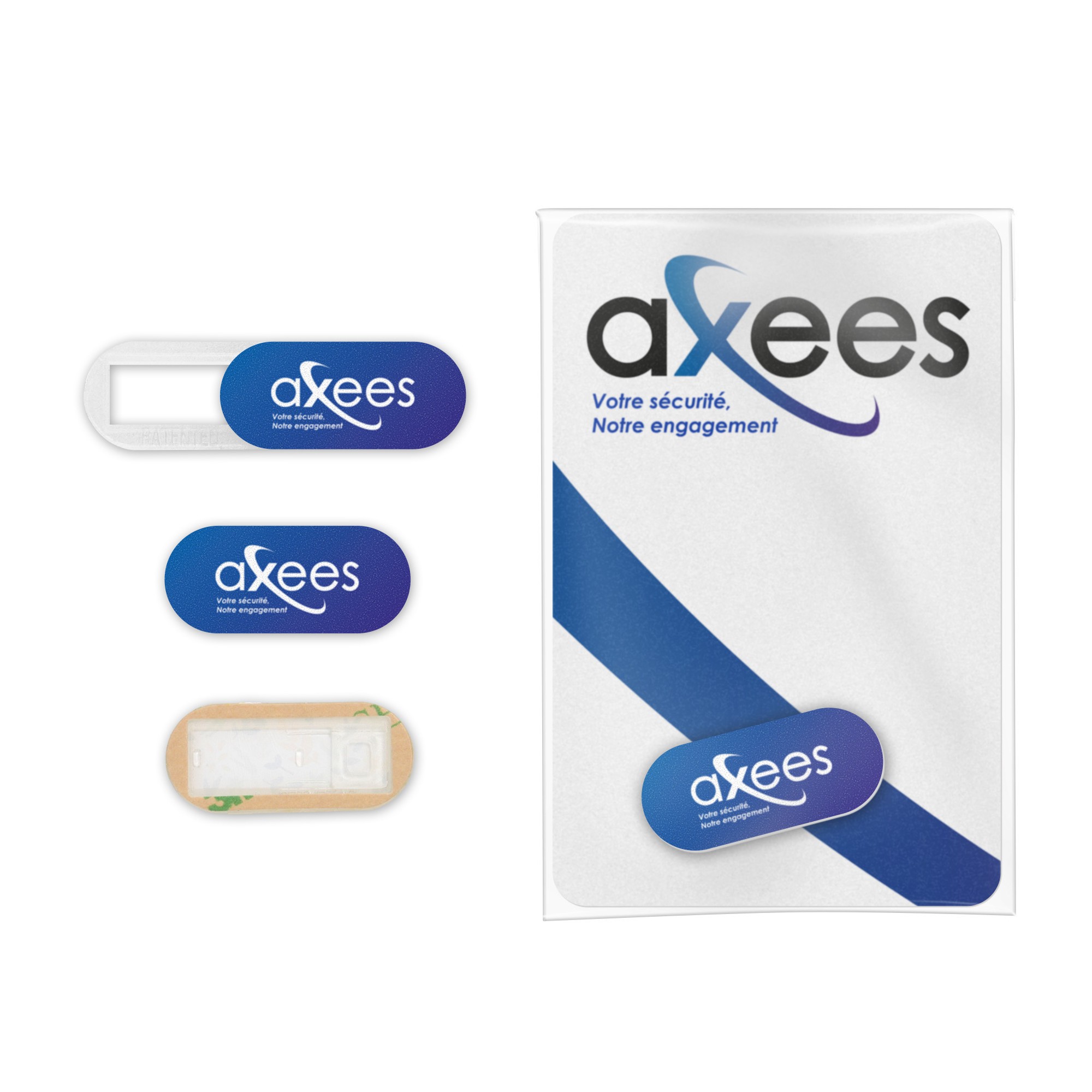 Cache webcam en PLA, 3M au dos. Livré sous poly bag biodégradable + cartonnette de présentation (85x55mm, 230gsm) avec possibilité de personnalisation quadri recto-verso sur demande. Un marquage quadri 1 position sur cache webcam inclus (hors frais techniques).
