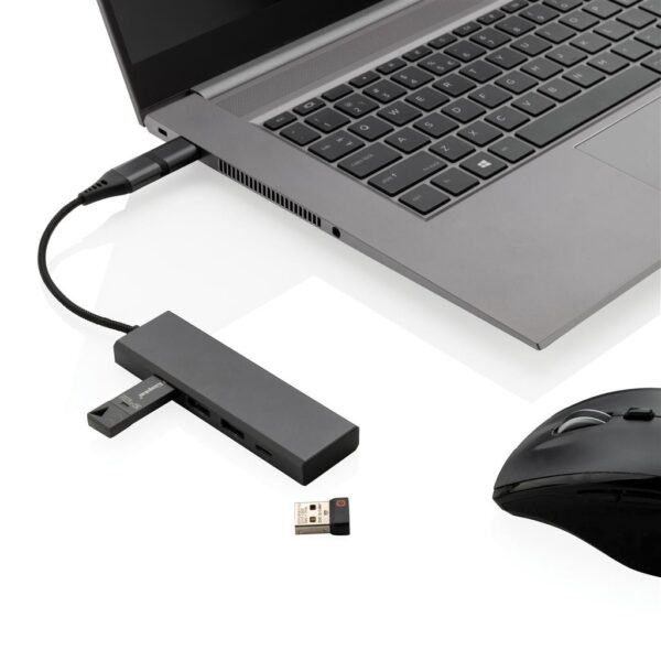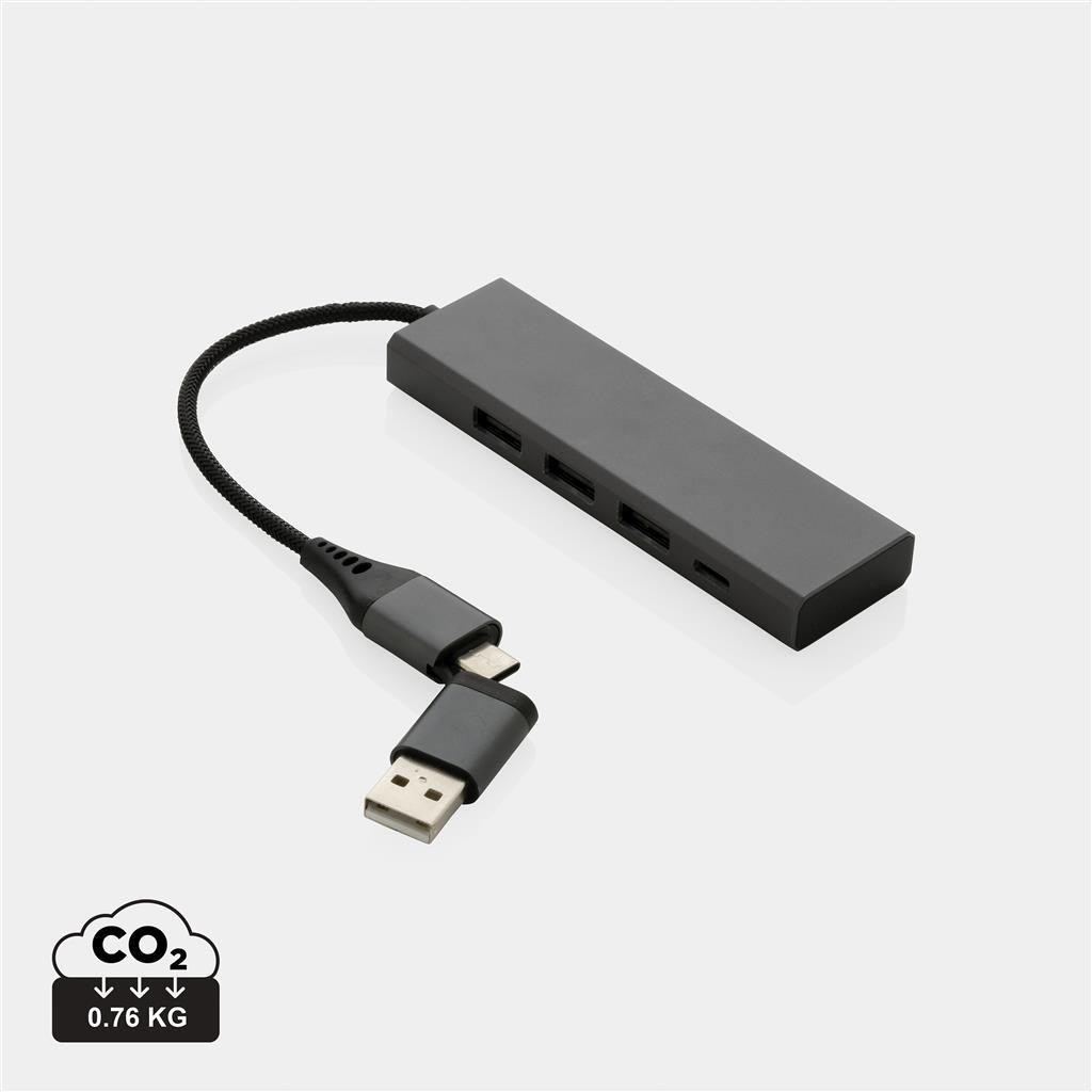 Hub USB fabriqué avec de l’aluminium recyclé certifié RCS (Recycled Claim Standard), de l’ABS, du TPE et du PET. Avec 3 ports USB A 2.0 et 1 port de type C. Le hub dispose d’un câble intégré de 10 cm fabriqué à partir de matériaux recyclés certifiés RCS TPE/PET. Contenu recyclé total : 75% sur la base du poids total de l’article. La certification RCS garantit une chaîne d’approvisionnement entièrement certifiée pour les matériaux recyclés. Avec son double connecteur d’entrée, il convient aux ordinateurs de type C et USB A. L’aluminium ne perd pas ses caractéristiques dans le processus de recyclage et peut être recyclé à l’infini. Article et accessoires 100% sans PVC. Emballé dans un emballage FSC mix.