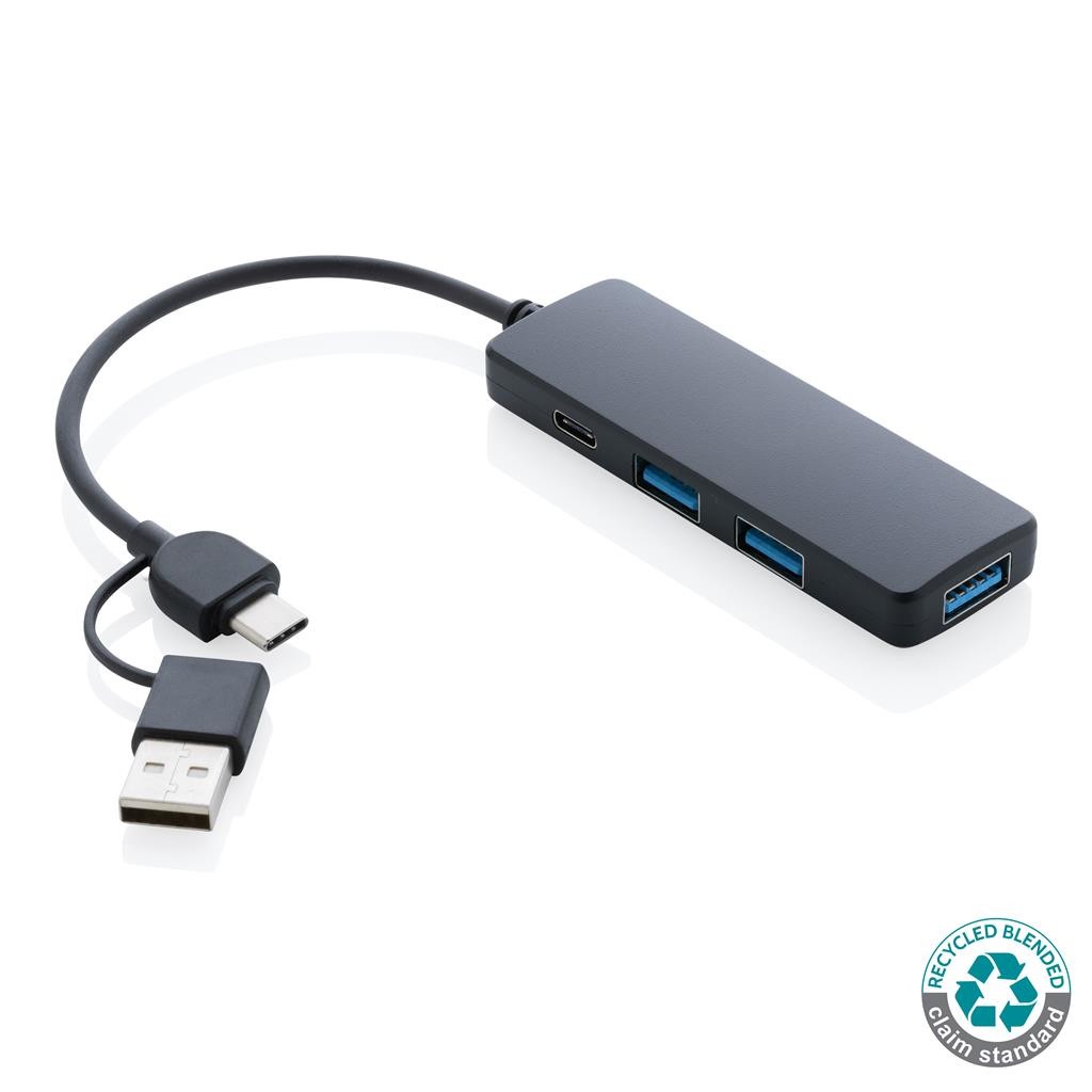 Hub USB avec boîtier fabriqué à partir de plastique ABS 100% recyclé selon la norme RCS. RCS (Recycled Claim Standard) est une norme permettant de vérifier le contenu recyclé d’un produit tout au long de la chaîne d’approvisionnement. Contenu recyclé total : 50 % sur la base du poids total de l’article. Avec 3 ports USB A 2.0 et 1 port de type C, le hub dispose d’un câble intégré de 8,5 cm en TPE 100% recyclé et certifié RCS. Avec un double connecteur d’entrée, il convient aussi bien aux ordinateurs de type C qu’à ceux de type A. Article et accessoires 100% sans PVC. Emballé dans un emballage mixte FSC.