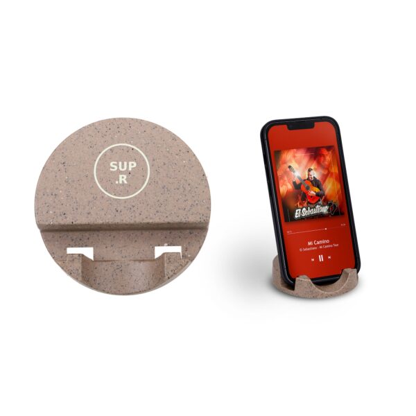 Support de téléphone 100% made in France 100% plastique biosourcé recyclé (maïs, amidon de pomme de terre) et déchet de coquille d’huitres et marc de café. Un marquage en quadri numérique 1 position inclus (hors frais techniques).