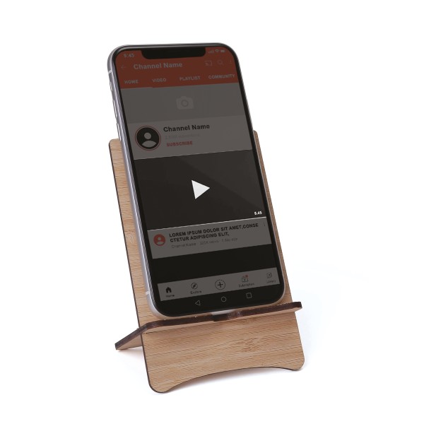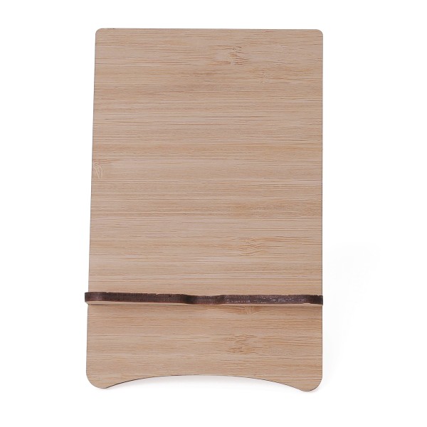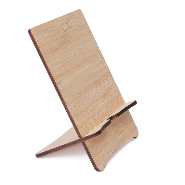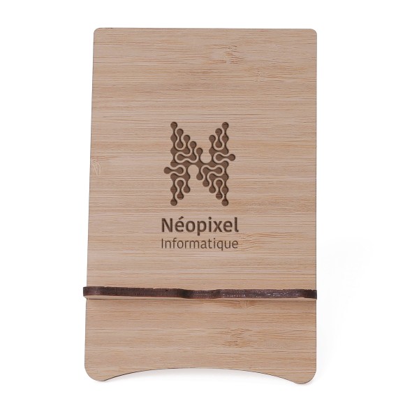 Support pour téléphone en bambou de 0.3mm d’épaisseur. Le téléphone peut être charger en même temps sur le support, grâce à l’emplacement pour passer le câble ! Un marquage quadri 1 position et frais techniques inclus.