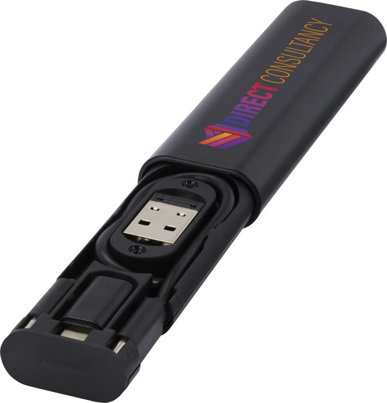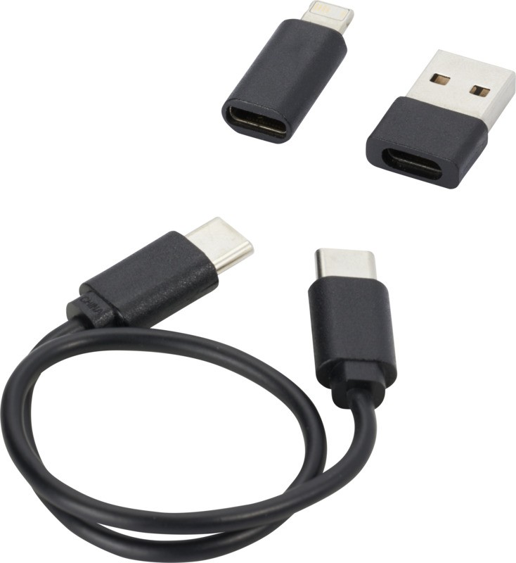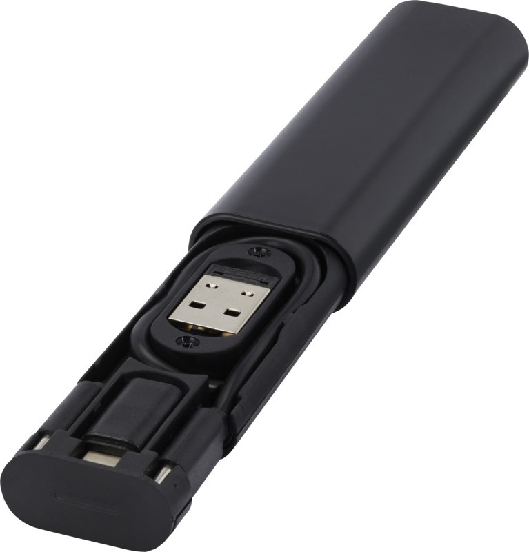 Câble modulaire de transfert de données et de recharge en plastique recyclé, livré dans une élégante boîte de rangement. Le câble offre de multiples solutions de recharge : Entrée type-C et USB-A, et sortie type-C/iOS/micro USB. Grâce à tous ces adaptateurs et connecteurs, ce câble vous permet de charger la plupart des smartphones, appareils photo, batteries de secours, écouteurs, etc. Le câble a une puissance de sortie maximale de 2 A. Comprend une broche d’éjection qui s’avère très pratique lorsque vous devez retirer la carte SIM de votre téléphone. La boîte de rangement peut également contenir une carte mémoire micro SD ainsi qu’une carte nano SIM, ce qui en fait l’accessoire de voyage idéal. Longueur du câble : 28 cm. Livré dans une enveloppe en papier Kraft 100 % recyclé. Plastique recyclé ABS. Fabriqué en Chine.