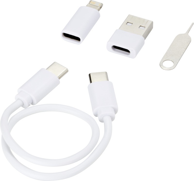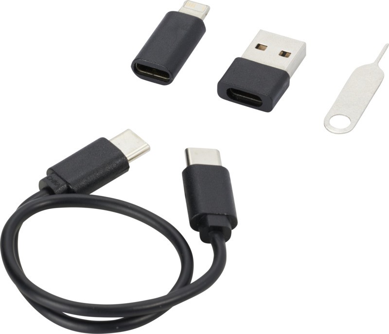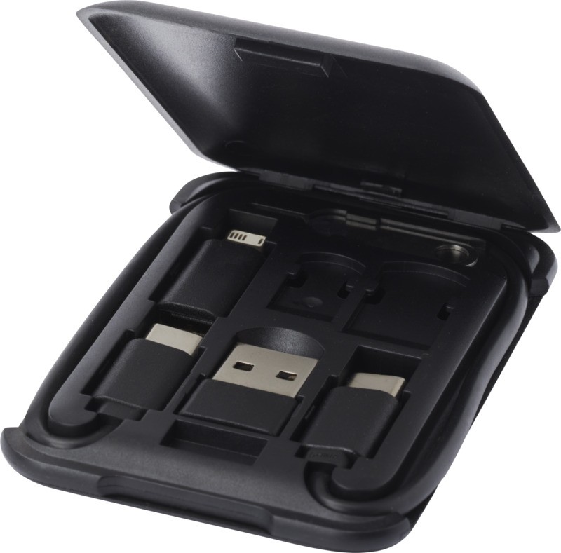Câble modulaire de transfert de données et de recharge en plastique recyclé, livré dans une élégante boîte de rangement qui sert également de socle de téléphone. Le câble offre de multiples solutions de recharge : Entrée type-C et USB-A, et sortie type-C/iOS/micro USB. Grâce à tous ces adaptateurs et connecteurs, ce câble vous permet de charger la plupart des smartphones, appareils photo, batteries de secours, écouteurs, etc. Le câble a une puissance de sortie maximale de 2 A. Comprend une broche d’éjection qui s’avère très pratique lorsque vous devez retirer la carte SIM de votre téléphone. La boîte de rangement peut également contenir une carte mémoire micro SD ainsi qu’une carte nano SIM, ce qui en fait l’accessoire de voyage idéal. Longueur du câble : 26 cm. Livré dans une enveloppe en papier Kraft 100 % recyclé. Plastique recyclé ABS. Fabriqué en Chine.