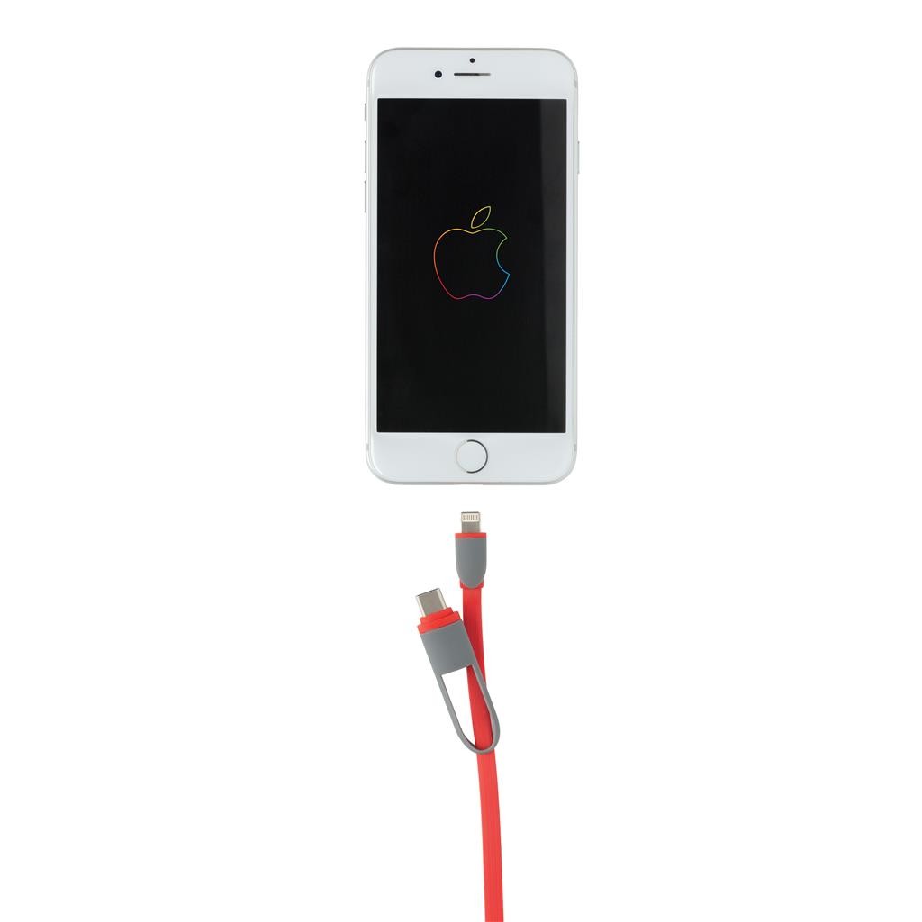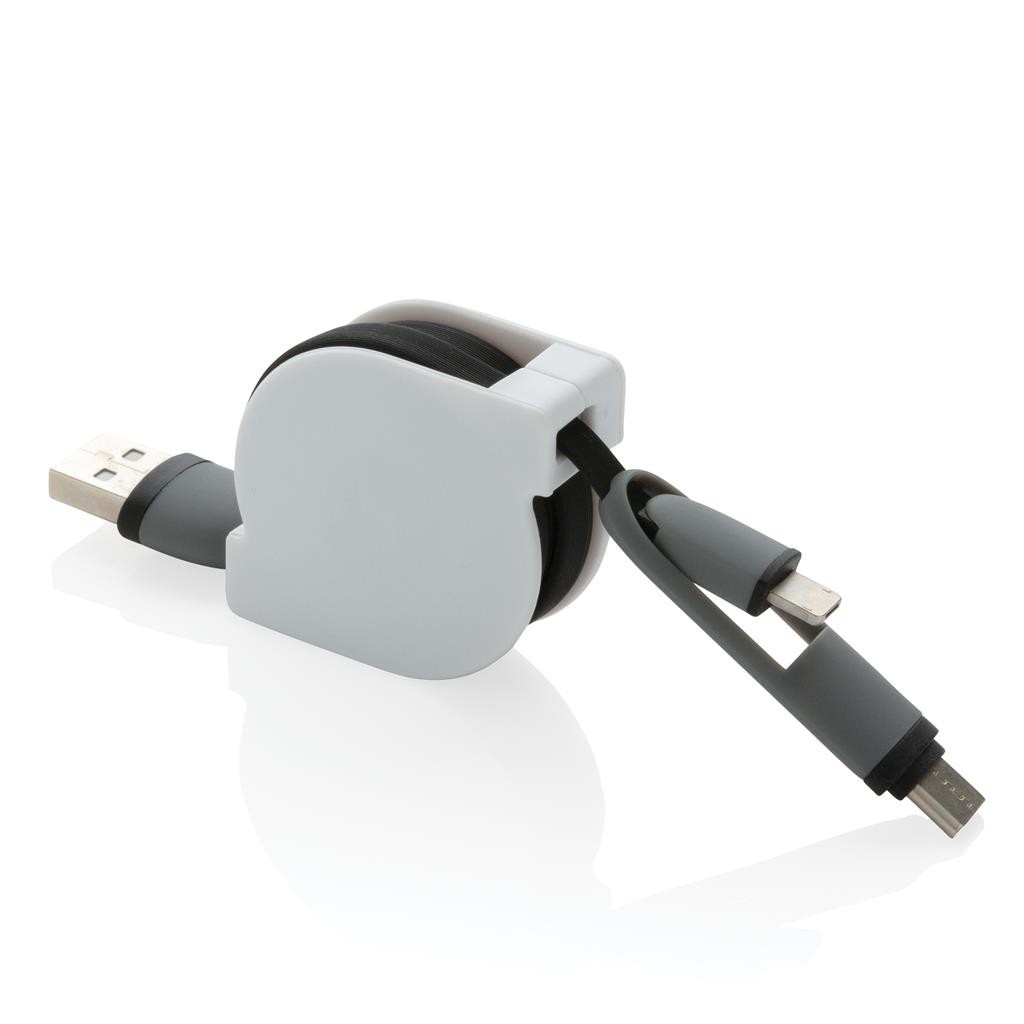 Câble de charge compact et rétractable 3 en 1 avec type C et connexion double pour IOS et Android qui nécessitent le micro USB. Grace à son mécanisme rétractable, le câble plat de 100cm peut facilement être emmené n’importe où sans s’emmêler. Boitier en ABS avec câble en TPU. Synchronisation possible. Fabriqué en Chine et imprimé en Europe.