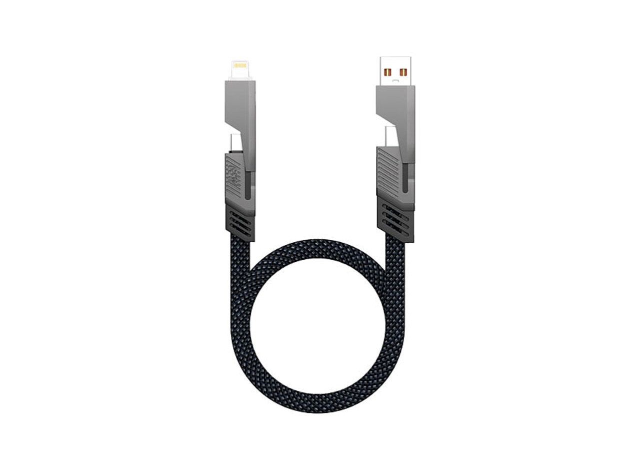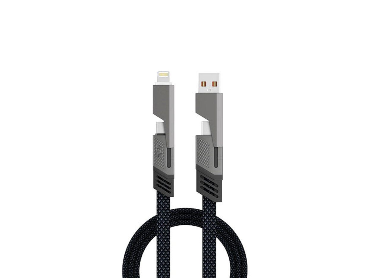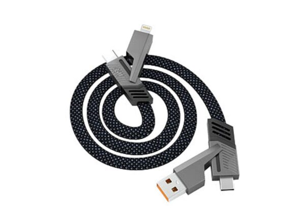 4 connectiques en 1 pour ce câble universel permettant de charger depuis des prises USB-A ou USB-C vers des prises USB-C ou Lightning. Charge rapide (60W max) et transfert de données USB 2.0 avec débit de transmission de 480Mbps. Structure en nylon et câble en cuivre. Attache en velcro incluse. Longueur : 1m.