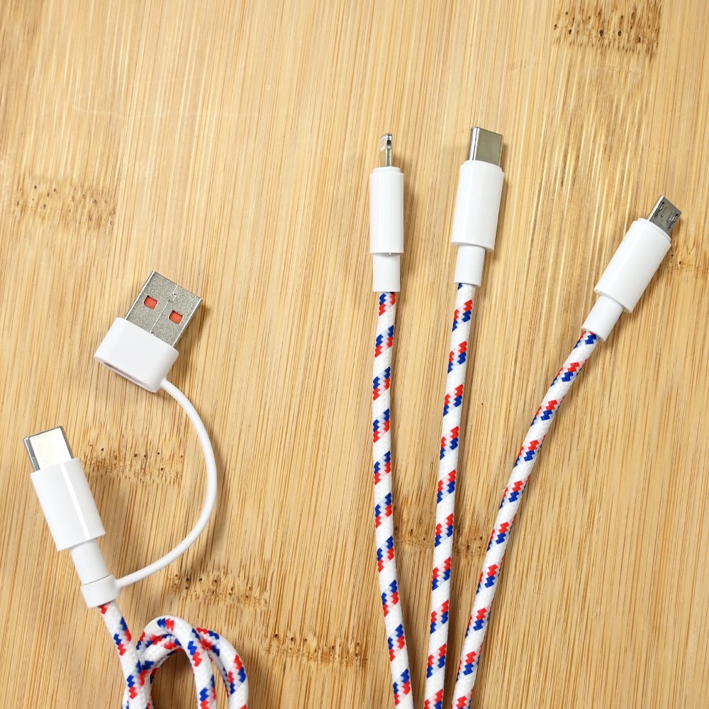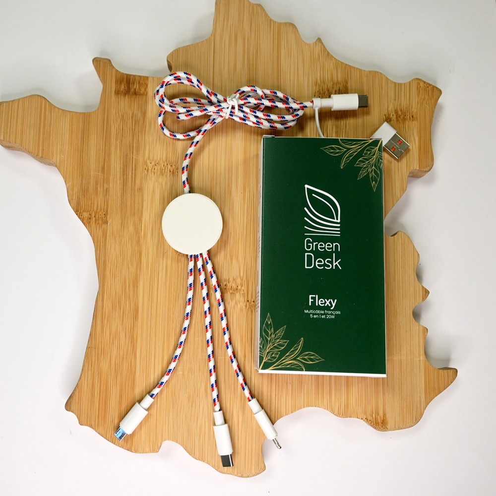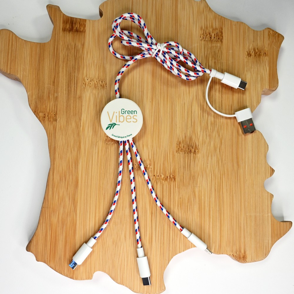 Multicables 5 en 1 avec coque en en PET Recyclé et cables en polyester recyclés. Entrée et sortie USB C + micro USB et lightning. Charge rapide 20W, livré sous boite coffret et fabriqué en France.