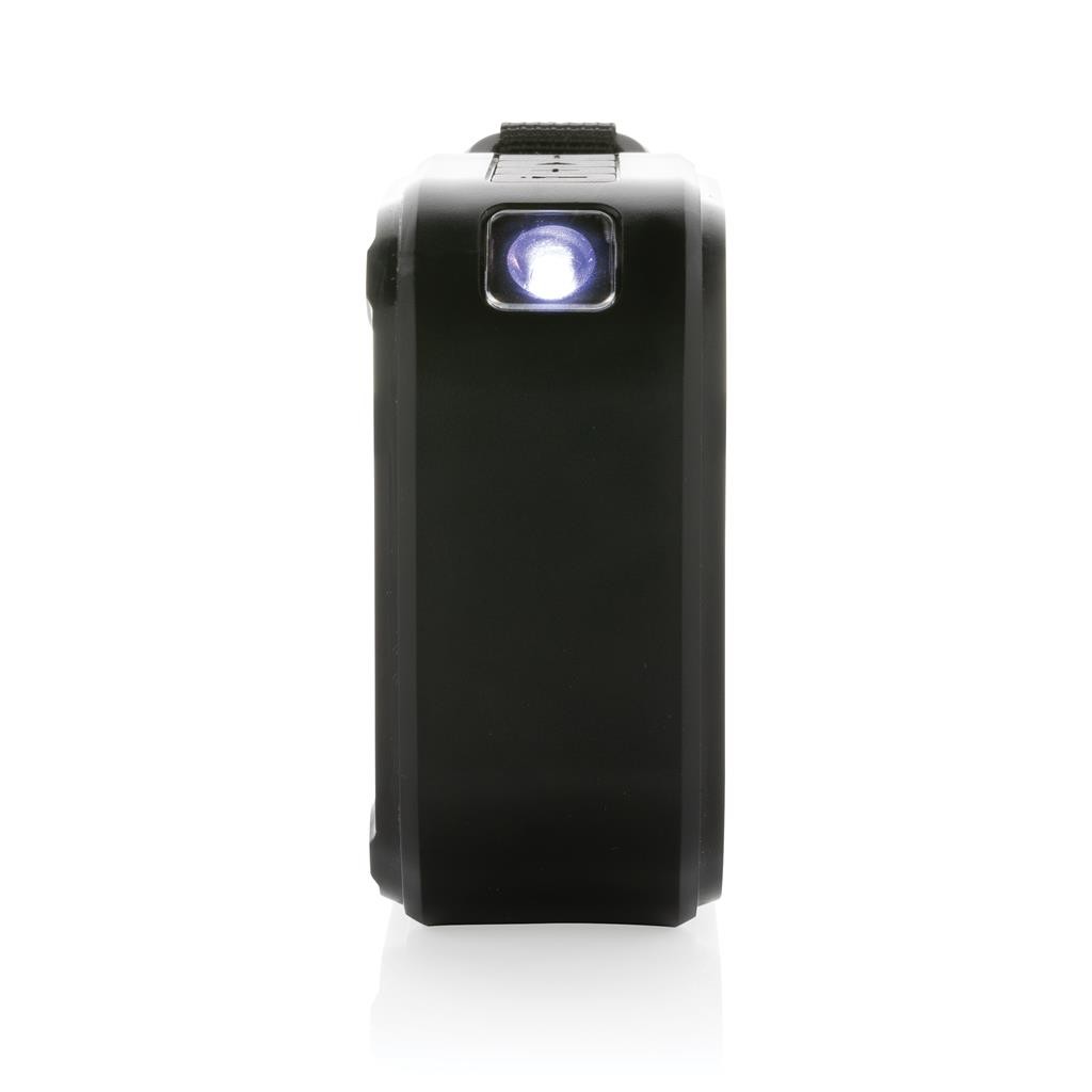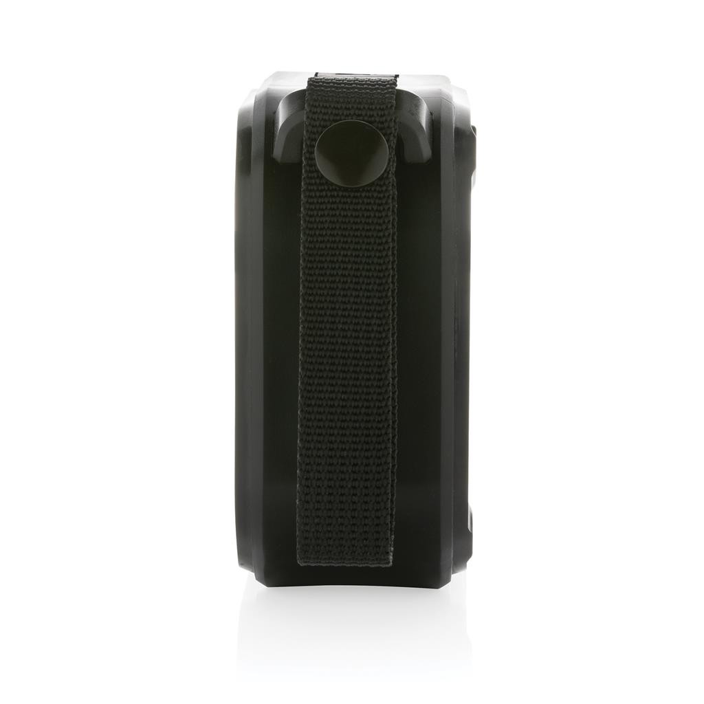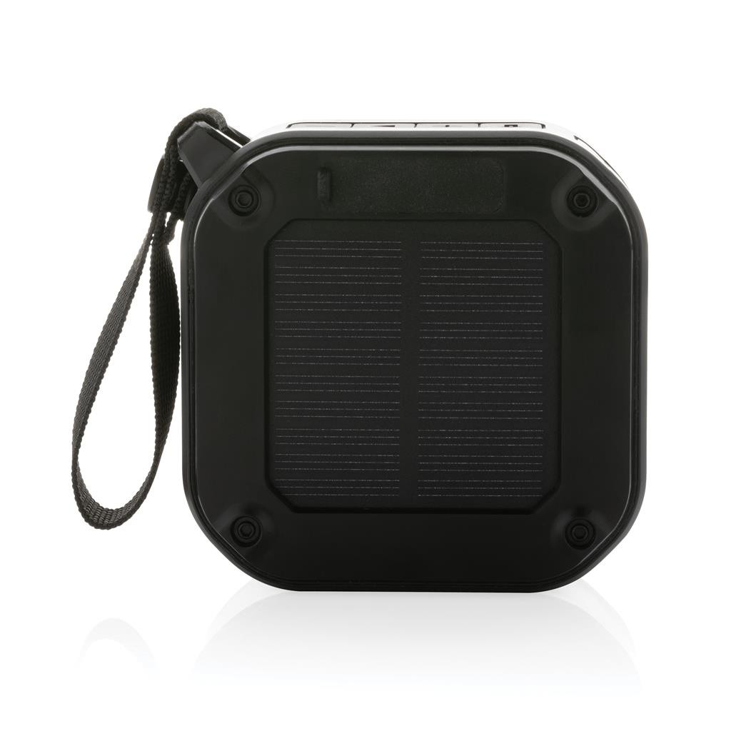 Haut-parleur sans fil de 3 W avec panneau solaire intégré à l’arrière, fabriqué en ABS recyclé certifié RCS. Contenu recyclé total : 38 % sur la base du poids total de l’article. La certification RCS garantit une chaîne d’approvisionnement entièrement certifiée pour les matériaux recyclés. Le haut-parleur utilise des panneaux solaires monocristallins avec un taux de conversion de 19 %. Le taux de charge dépend des conditions. Vitesse de charge solaire : 5V/80mA. Le haut-parleur est équipé d’une batterie de 400 mAh pour assurer jusqu’à 5 heures d’autonomie et de la technologie BT5.3 pour une connexion fluide et un son clair. Portée de connexion jusqu’à 10 mètres. Fonction micro et prise d’appel. Avec lampe LED intégrée de 30 lumens. Emballé dans une boîte FSC® mix. Câble de chargement en TPE recyclé certifié RCS inclus. Article et accessoires 100% sans PVC. Étanchéité IPX 5.