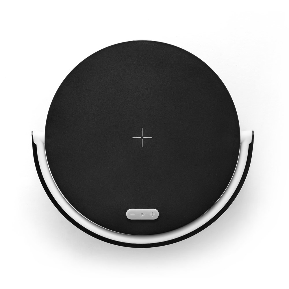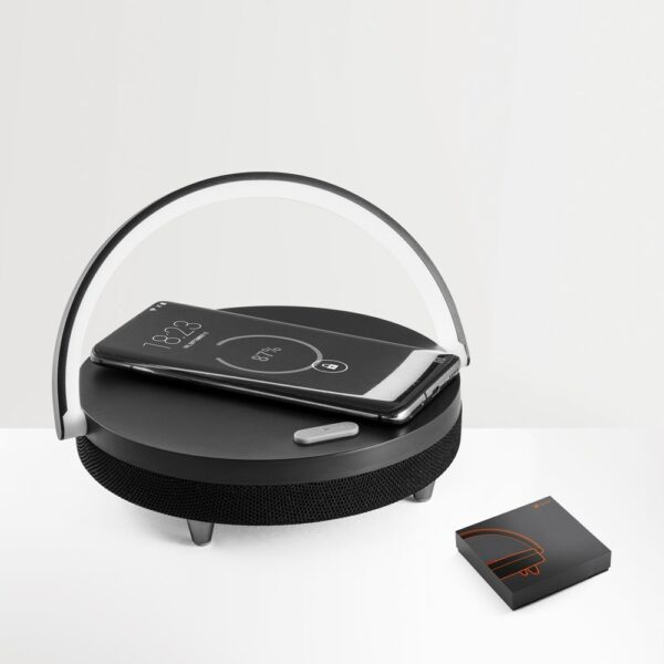 Enceinte 4-en-1 en ABS, PP et tissu. Son design audacieux lui permet d’être utilisé comme support de téléphone portable ainsi que comme lampe à 3 niveaux d’intensité avec un chargeur sans fil 10W d’une capacité de 1200 mAh, des entrées 5V/2,1A et 9V/1,67A et des sorties 5V/1A et 9V/1,2A. Fourni dans une boîte cadeau noire avec un câble de chargement.