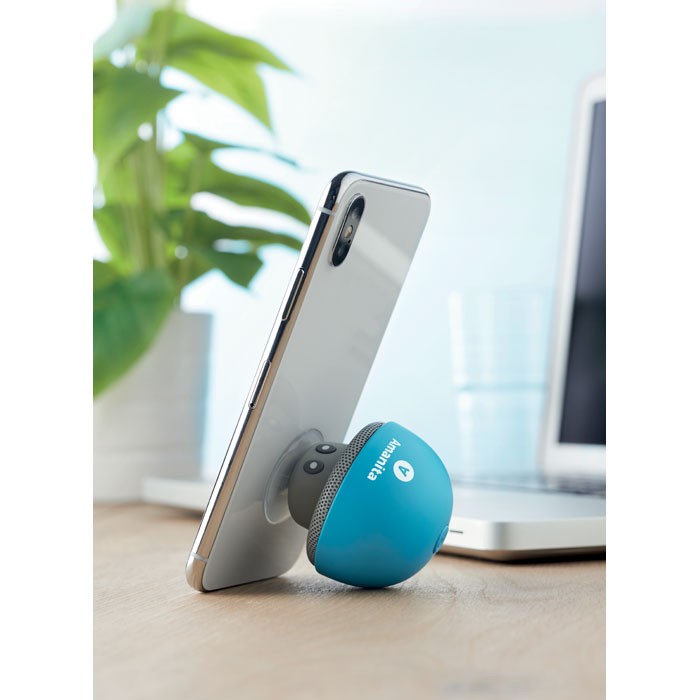 Haut-parleur téléphone Bluetooth 5.0 forme champignon en ABS avec ventouse. Pile rechargeable lithium 180 mAh incluse. Câble USB. Sortie 4 Ohm, 5V et 3W. Fabriqué en Chine.