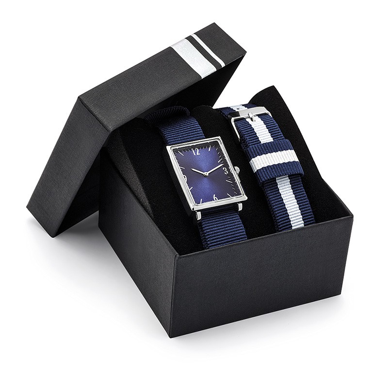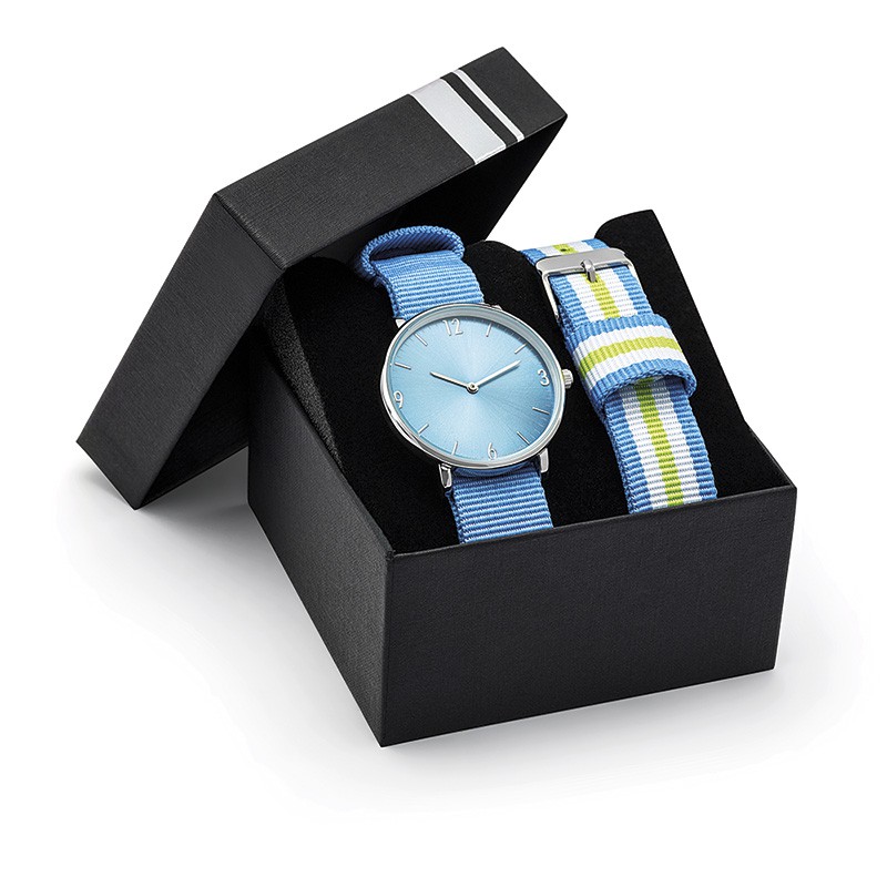 Montre ronde avec boitier métal finition chromée taille mixte 38 mm ou rectangulaire 34*28 mm, 7 cadrans soleillés avec index, mouvement Citizen 2035 ou Seiko PC 21, étanche 30 mètres, bracelet Nato interchangeable (assorti au cadran, 15 coloris au choix, 7 unis et 8 rayés), sur mesure à partir de 300 pièces, livré sous écrin luxe spécifique et garantie 5 ans. Un marquage 3 couleurs 1 position et frais techniques inclus.