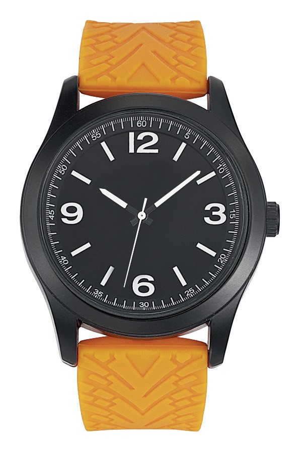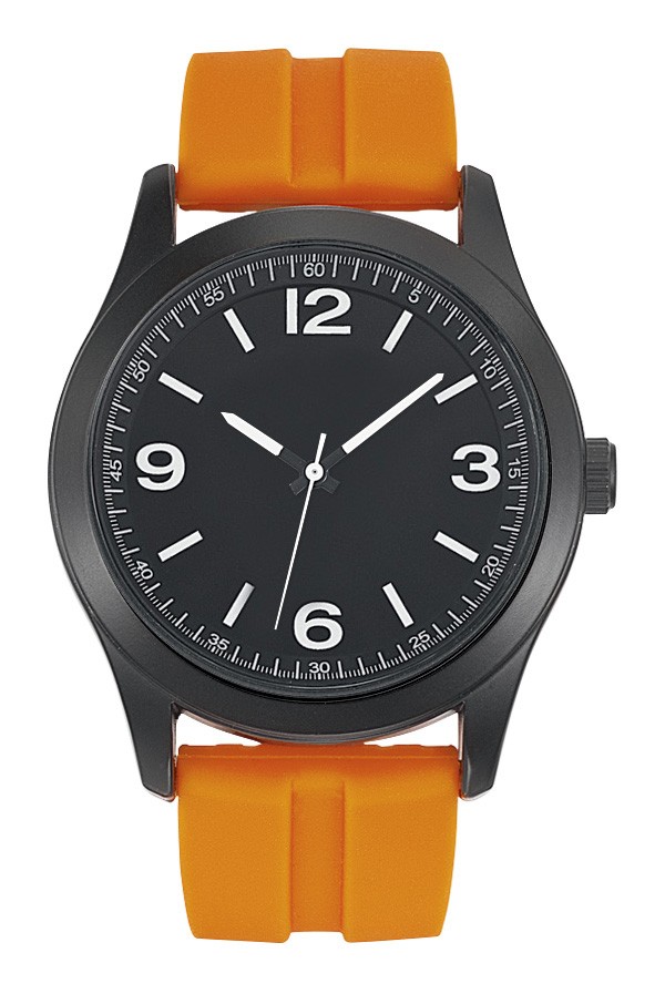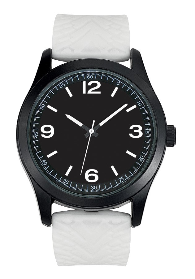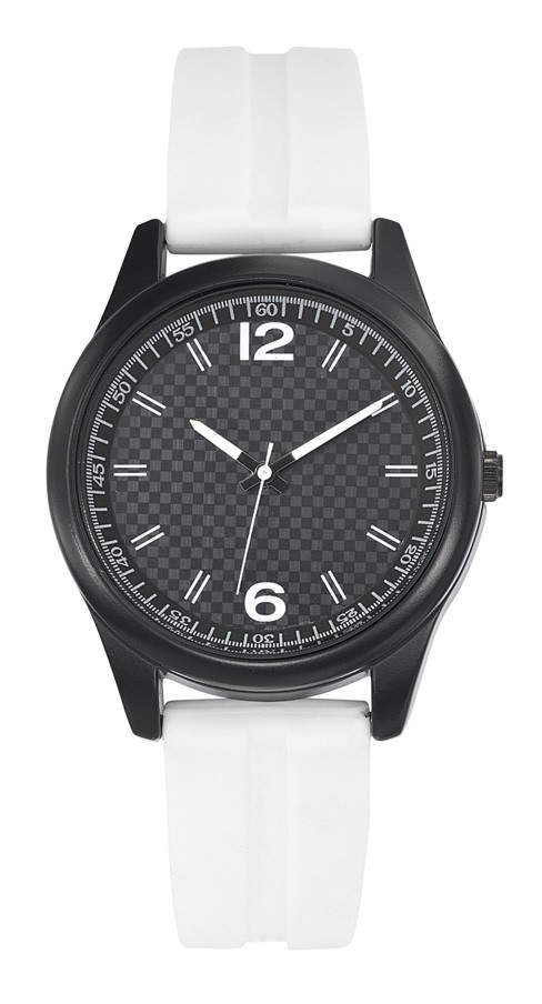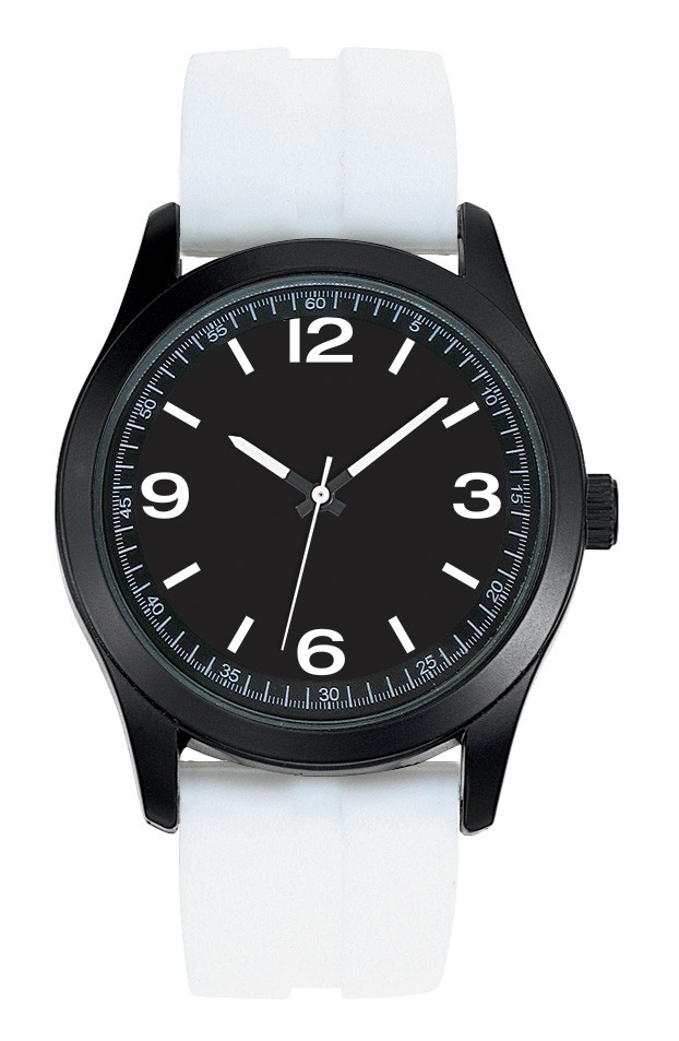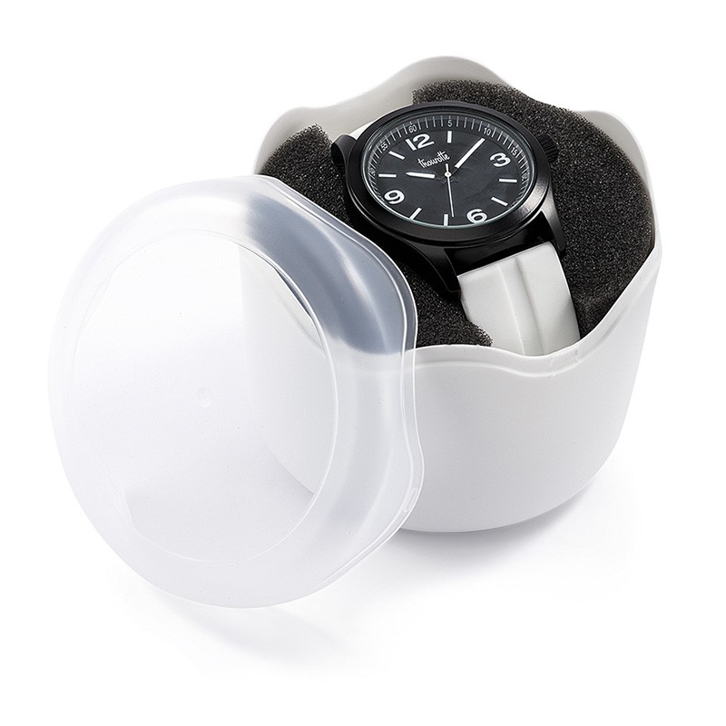 Boitier plastique finition noir mat diamètre 41 mm, cadran imprimé blanc ou noir, bracelet silicone lisses ou empreintes, marquage 3 couleurs sur cadran, mouvement Citizen 2035 et livré dans écrin boîte plastique ronde. Montre assemblée en France et garantie 5 ans. Un marquage 3 couleurs 1 position et frais techniques inclus.