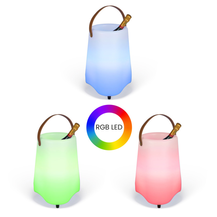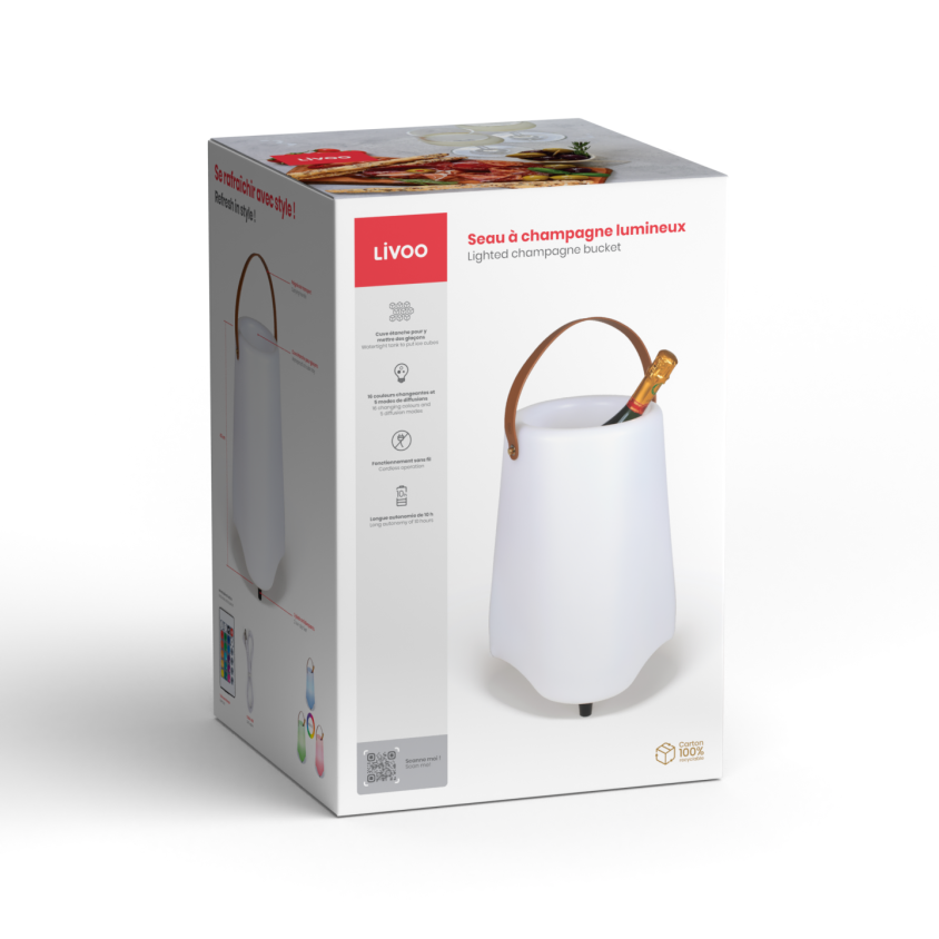 Seau lumineux 12 LED RGB avec cuve étanche pour glaçons. 16 couleurs changeantes, 5 modes de diffusion : fixe, aléatoire, fondu, transition, flash et batterie 2000 mAh, autonomie jusqu’à 10 h. Poignée de transport, 3 pieds antidérapants, câble USB et télécommande inclus.