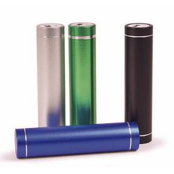Batterie lithium-ion en aluminium de 2 200 mAh, Input : 5v/0,8A, Output : 5v/1A avec témoin de charge lumineux, sous boite carton blanche, câble USB/micro USB inclus. Fabriqué en Chine.
