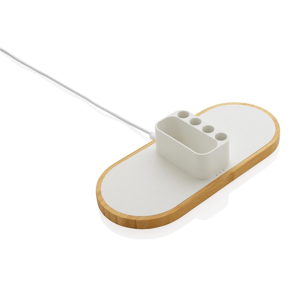 Chargeur à induction 10W double avec porte-stylo Ontario fabriqué avec RCS certifié ABS recyclé. Teneur totale en matières recyclées : 31% en fonction du poids total de l’article. La certification RCS garantit une chaîne d’approvisionnement entièrement des matériaux reyclées. La base du produit est fabriquée en FSC®100% bambou. Chargeur à induction compatible avec les dernières générations d’Android, Iphone 8 et plus. Peut charger jusqu’à 2 téléphones en même temps ou n’importe quel autre appareil sans fil. Le porte crayon dispose de 4 espaces pour ranger les crayons ou petit rangement tels que cartes de visites ou autres petits objets. Article et accessoires sans PVC. Contient un câble de charge de type C de 120cm fabriqué à partir de TPE recyclé certifié RCS. Emballée dans une boîte kraft FSC® mix. Type-C in; Entrée 5V/2A; 9V/2A; Sortie sans fil 5V/1A; 9V/1. 1A; (10W). Modèle déposé®.