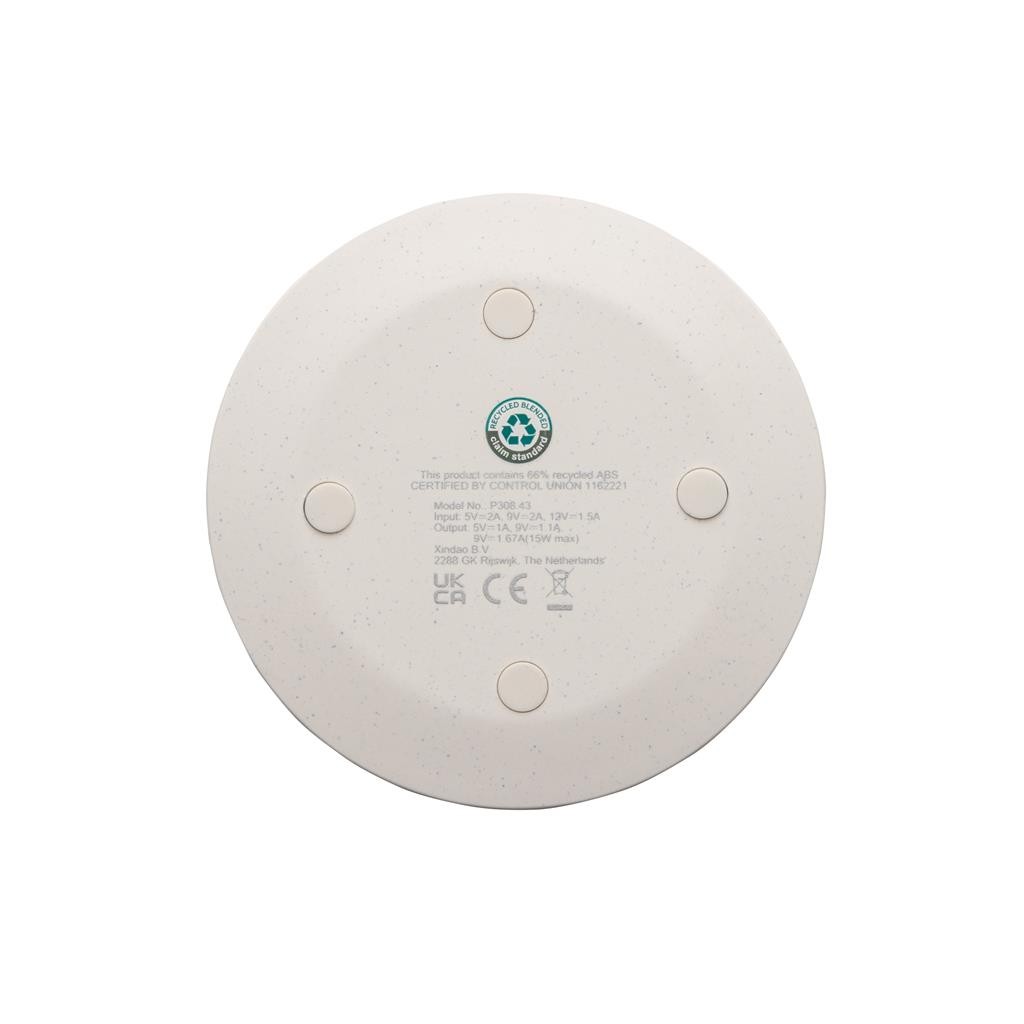 Chargeur sans fil ultra rapide de 15W fabriqué en ABS recyclé certifié RCS (Recycled Claim Standard). Contenu recyclé total : 66 % sur la base du poids total de l’article. La certification RCS garantit une chaîne d’approvisionnement entièrement certifiée des matériaux recyclés. Chargeur sans fil compatible avec les dernières générations d’Android, l’iPhone 8 et les versions ultérieures. Article et accessoires sans PVC. Câble de chargement de 120 cm de type C fabriqué à partir de TPE recyclé certifié RCS inclus. Emballé dans une boîte kraft FSC mix. Entrée Type-C ; Entrée 5V/2A ; 9V/2A ; 12V/1.5A ; Sortie sans fil 5V/1A ; 9V/1.1A ; 9V/1.67A(15W).