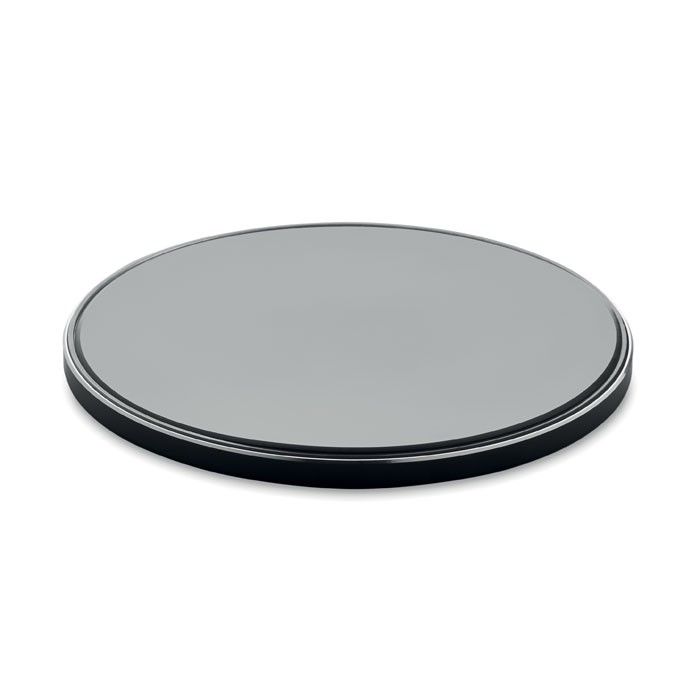 Chargeur sans fil en aluminium 10W avec verre sur le dessus. Lumière bleue lors de la charge. Sortie : DC 9V/1.1A. Compatible avec les derniers androïdes, iPhone® 8, X et plus récents.