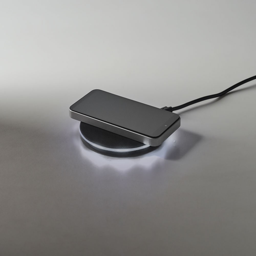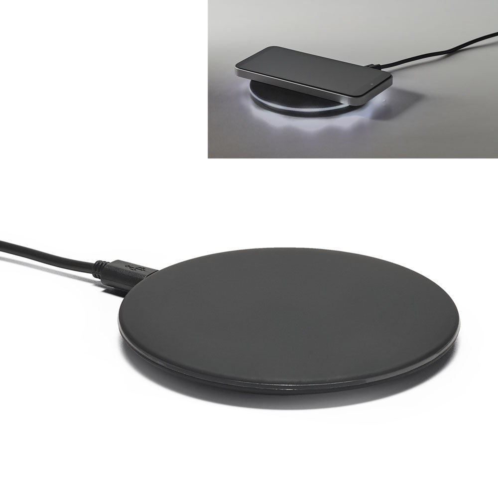Chargeur sans fil rapide en ABS avec finition caoutchoutée et rétroéclairée. Puissance de charge sans fil maximale de 10 W pour une charge rapide. Compatible avec les appareils dotés de la technologie de charge sans fil. Comprend un câble USB de 1 m. Livré dans un coffret cadeau. Fabriqué en Chine.