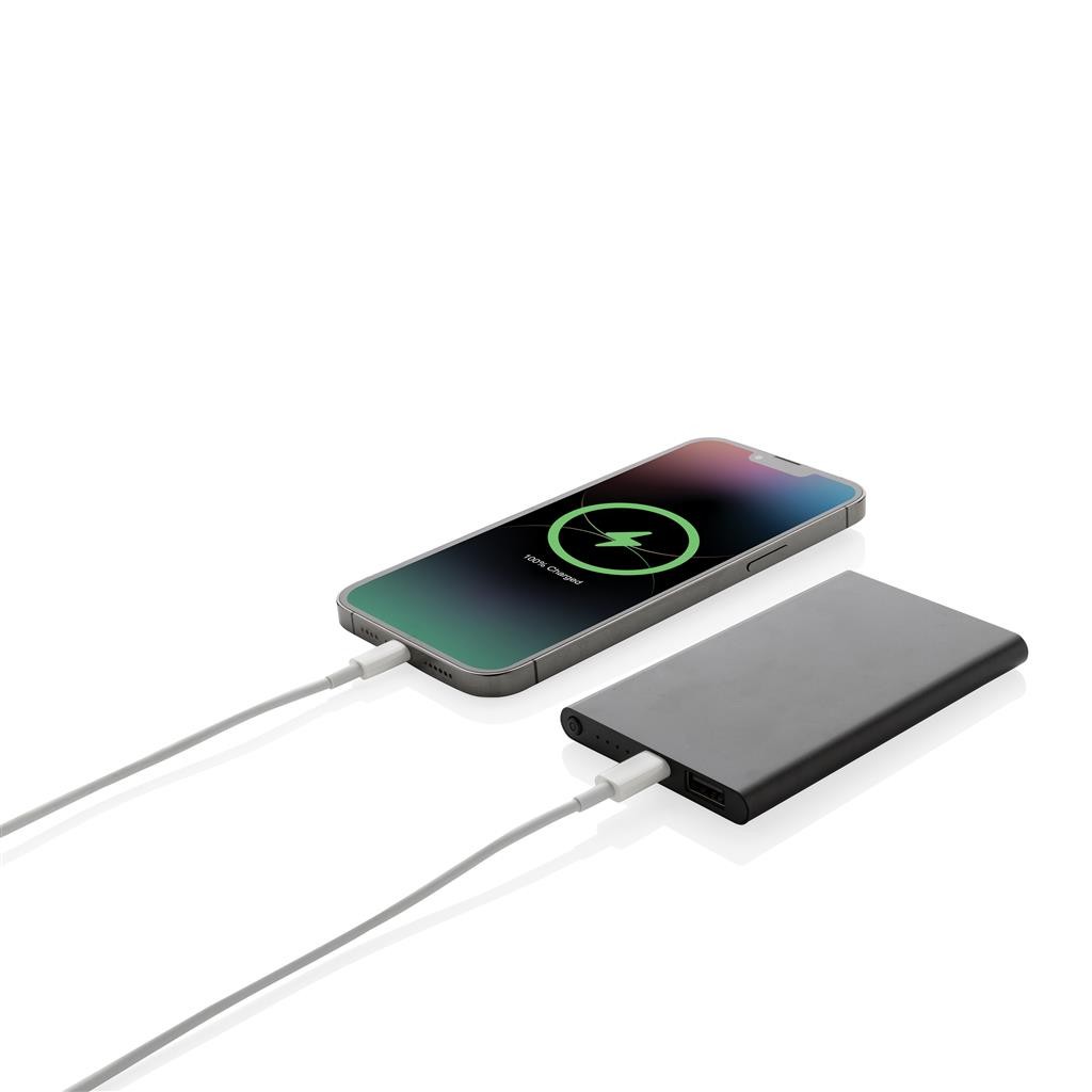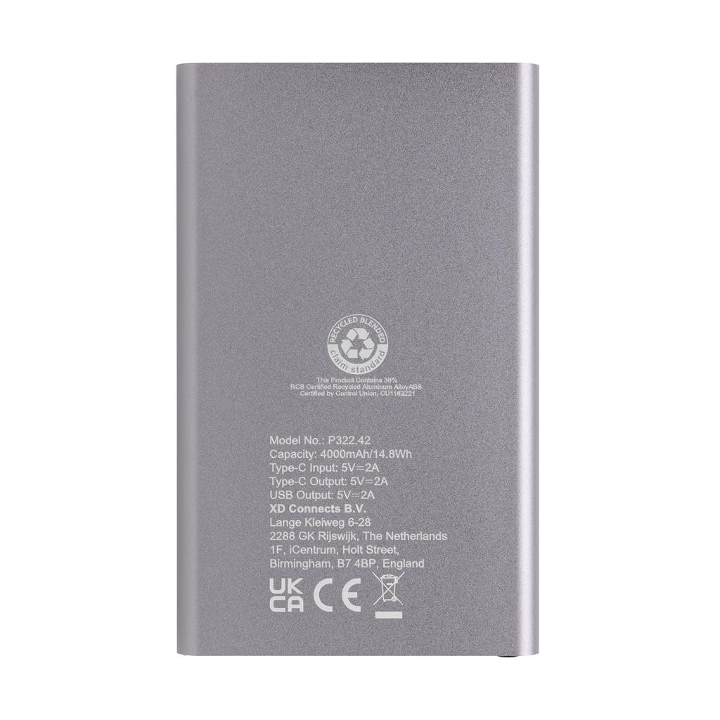 Batterie de secours 4000 mAh au design plat, dont le boîtier est fabriqué à partir de plastique aluminium/ABS recyclé certifié RCS. RCS (Recycled Claim Standard) est une norme qui permet de vérifier le contenu recyclé d’un produit tout au long de la chaîne d’approvisionnement. Contenu recyclé total : 36 % sur la base du poids total de l’article. Le powerbank prend en charge la charge via l’USB A et le type C. Le powerbank contient une batterie lithium-polymère de qualité A de longue durée de 4000 mAh. Les indicateurs de puissance indiquent le niveau d’énergie restant afin que vous sachiez toujours quand recharger. ; Entrée Type-C 5V/2A ; Sortie Type C:5V/2A Sortie USB A : 5V/2A. L’article et les accessoires sont exempts de PVC. Câble de recharge en TPE recyclé certifié RCS inclus. Emballé dans un emballage FSC® mix.