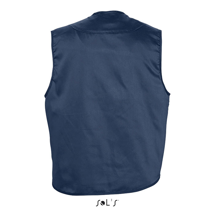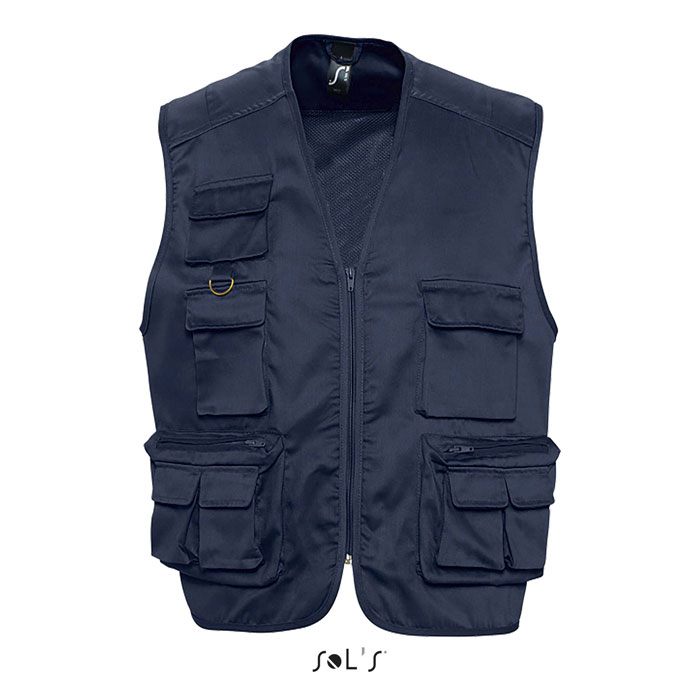 Gilet reporter multipoches, 65% polyester – 35% coton polycoton 200, 9 poches dont 1 poche téléphone, demi doublure dos libre en filet nylon (mesh).
