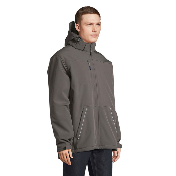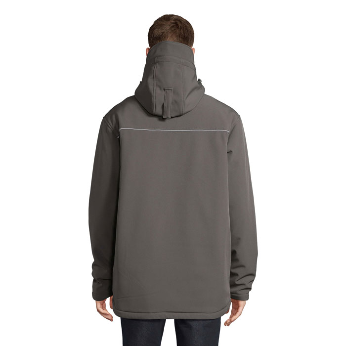 Parka softshell homme, extérieur : 94% polyester – 6% élasthanne; Doublure et matelassage : 100% polyester; 3 couches, membrane 8000 mm imperméable et respirant. Softshell 340 hiver entièrement matelassée, capuche, avec visière, détachable et ajustable avec lien de resserrage et stoppeurs + bande auto-agrippante ajustable. 3 poches zippées devant + 1 poche zippée manche + 1 poche zippée intérieure + 1 poche intérieure en filet; Poignets ajustables avec bande auto-agrippante avec poignets resserrés stretch à l’intérieur cordons de resserrage bas de vêtement. Disponible également en modèle femme (S46804MO)