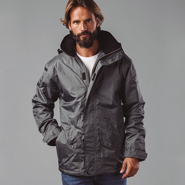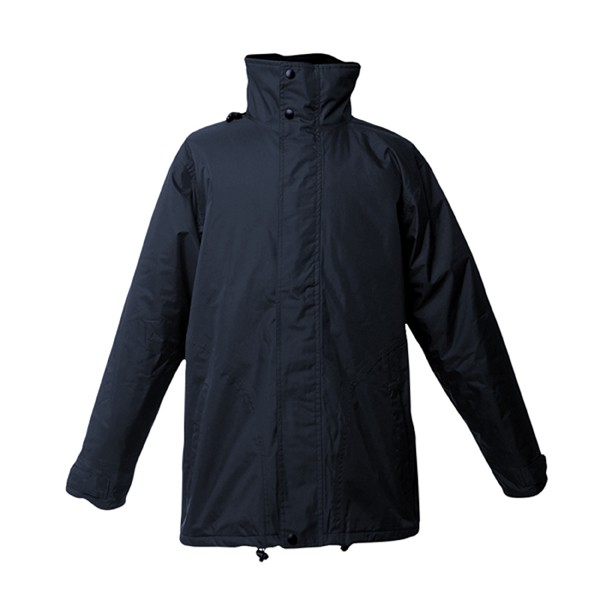 Parka rembourré (unisexe) 100% polyester (extérieur : 240 g/m² 100% polyester pongé 240 et revêtement PVC imperméable ; intérieur : 65 g/m² 100% polyester taffeta ; rembourrage : 100 % polyester 80 g/m²). Col doublé de maille polaire noire (fermeture par bande autoagrippante (scratch) ). Capuche à col rabattable, réglable avec stoppeurs noirs. Ouverture avec rabat, fermeture zip, fermeture autoagrippante (scratch) et boutons pression noirs. Contient 2 poches extérieures avec rabat et 2 poches intérieures (1 pour téléphone portable) avec fermeture autoagrippante (scratch) . Poignets intérieurs en maille côtelée 2×2 et poignets extérieurs réglables par bandes autoagrippante (scratch) . Coutures thermo-soudées. Accès zippé au bas du dos pour faciliter la personnalisation. Fabriqué au Bangladesh.