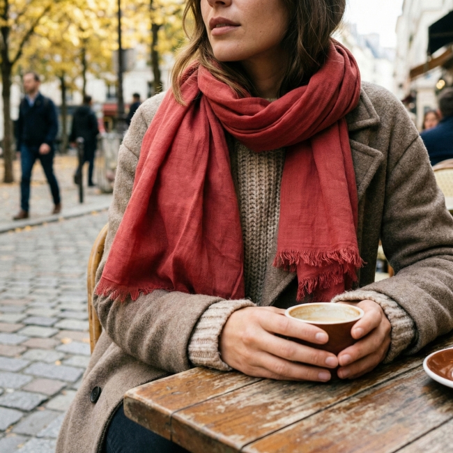 Echarpe légère et respirante 100% coton 95g/m² avec petites franges. Artisanat traditionnel : tissage à la main, à l’aide d’un métier à tisser manuel. Fabriqué en Inde et imprimé en France.