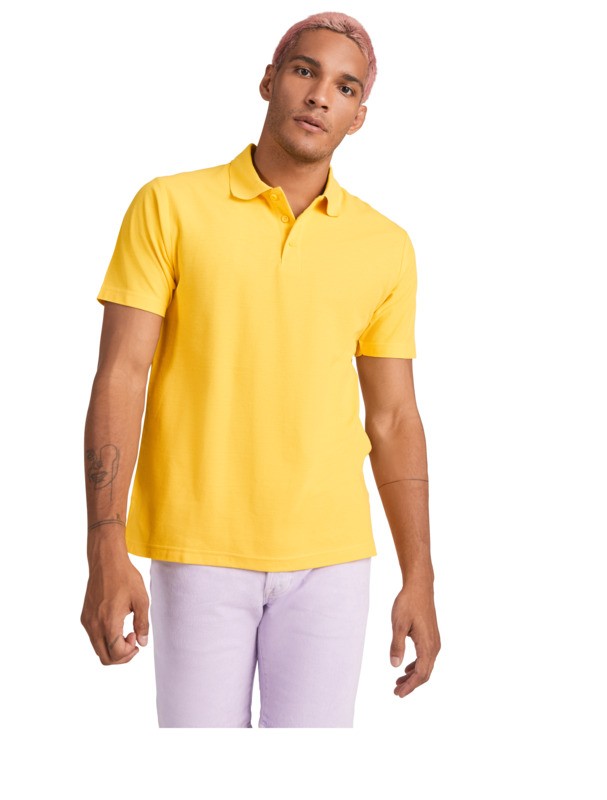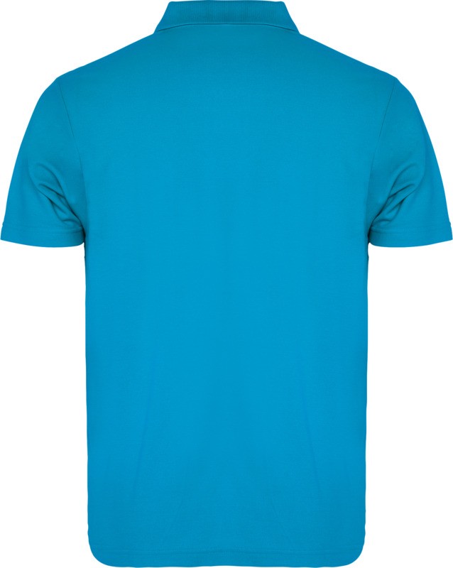 Polo à manches courtes avec patte de boutonnage à 3 boutons et col en côte 1×1. Coutures recouvertes renforcées au col. Étiquette détachable. Le mannequin mesure 190 cm et porte la taille L. Maille piquée 100% Coton, 180 g/m².