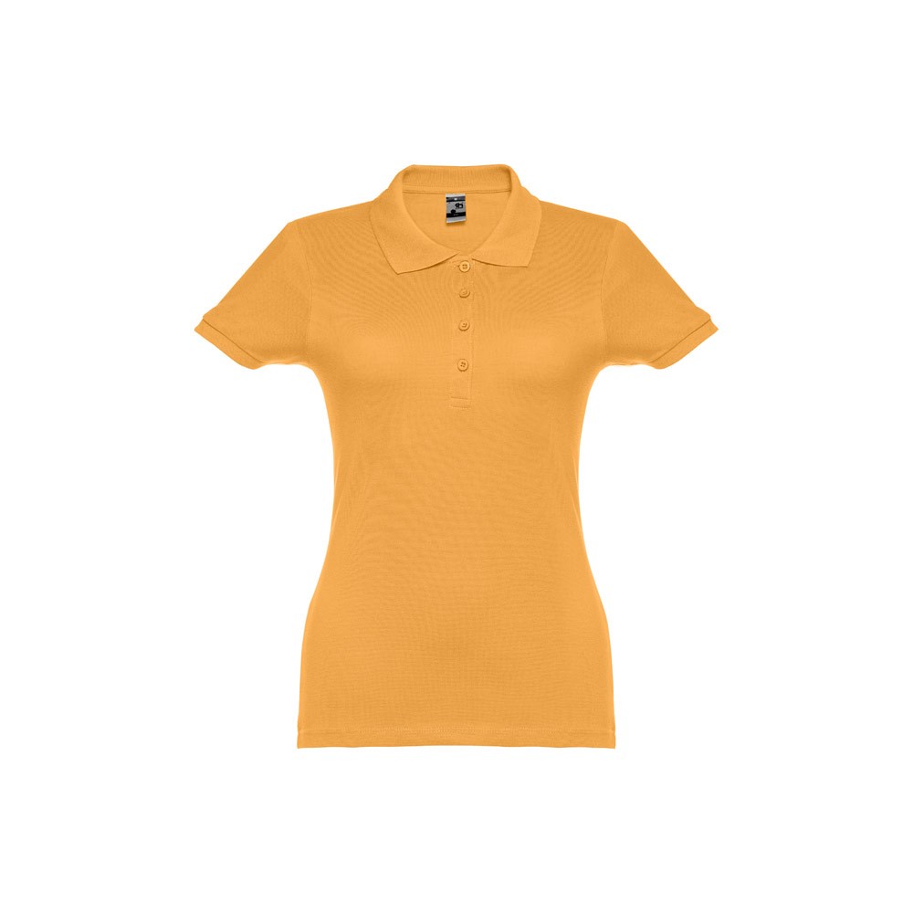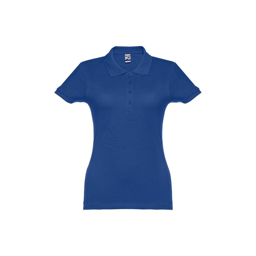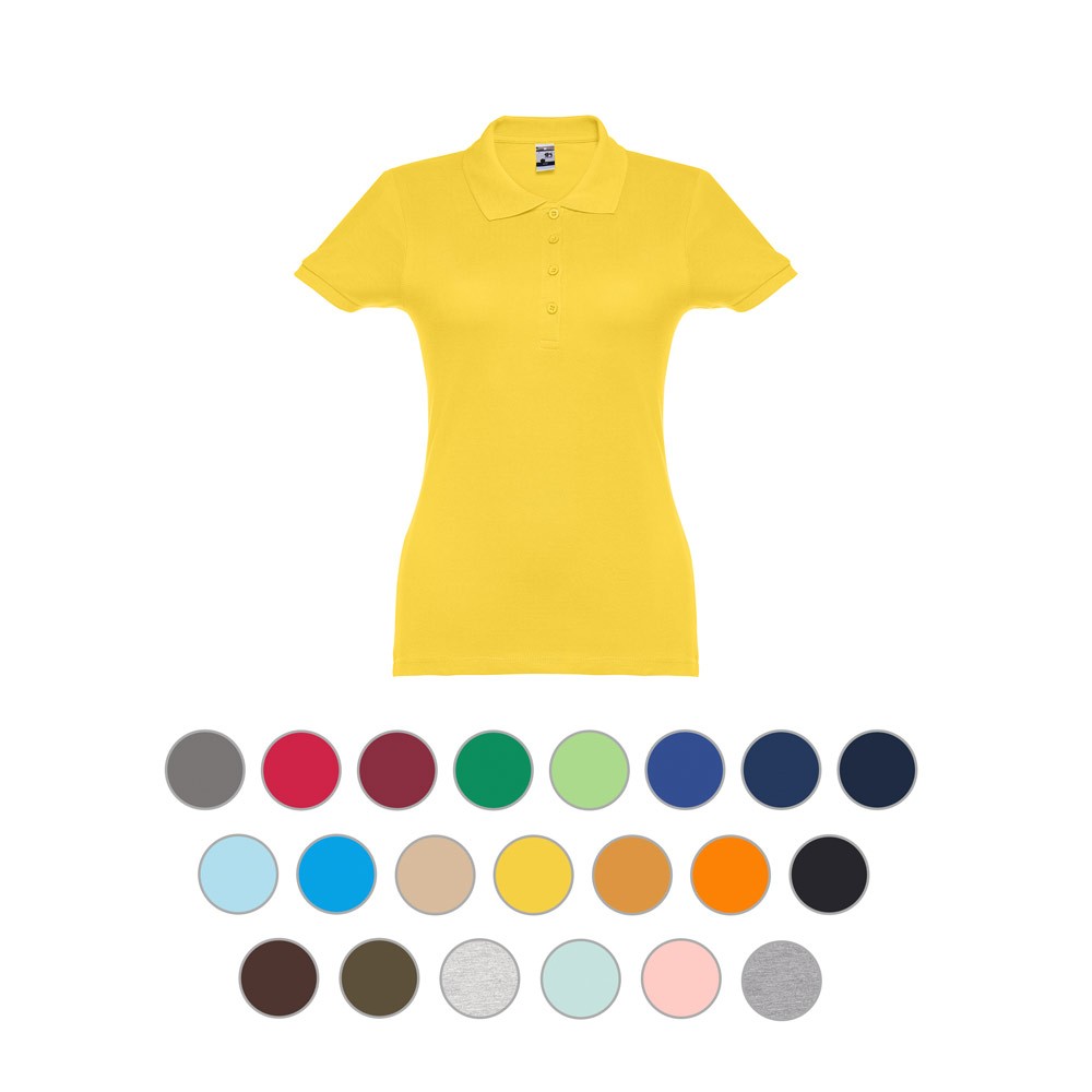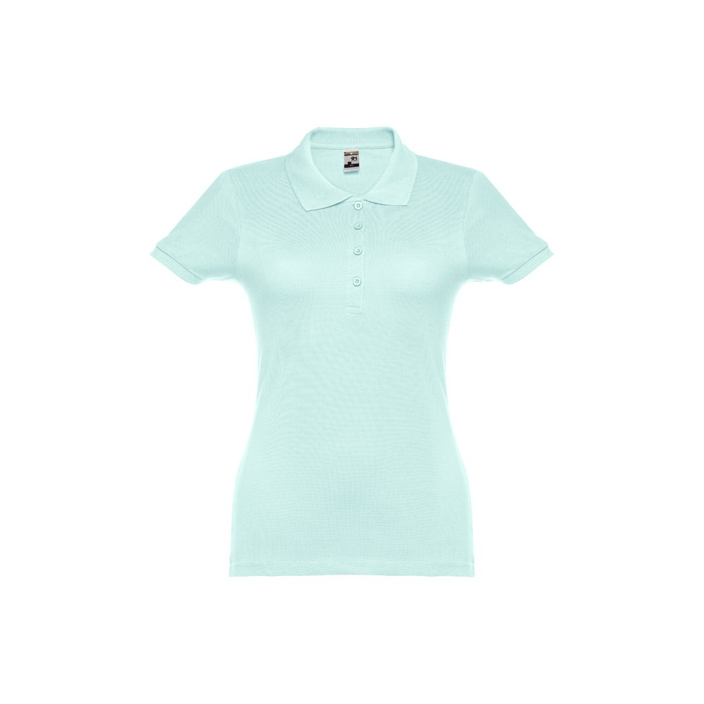 Polo ceinturé pour femme à manches courtes en maille piquée 100% coton (195 g/m²) cardé. Contient un col et des manches côtelés, le col est renforcé avec du ruban piqué. Sur le devant, à côté du col, il y a quatre boutons colorés (bouton de remplacement inséré dans la couture intérieure). Pièce coupée et cousue. Fabriqué au Bangladesh.