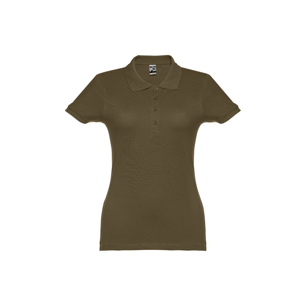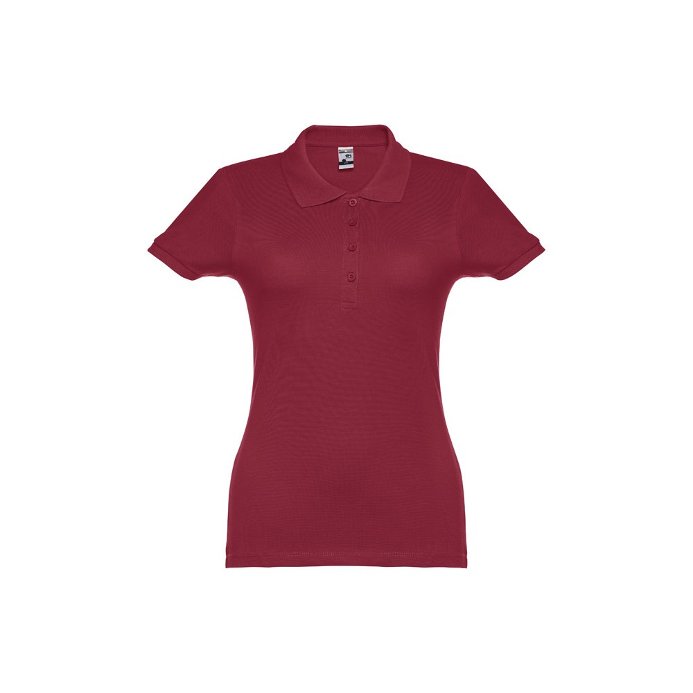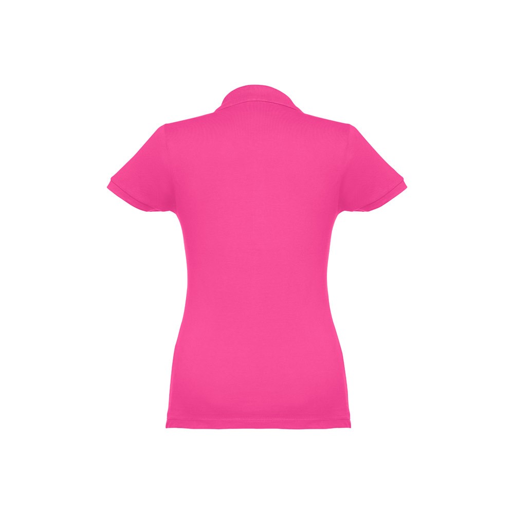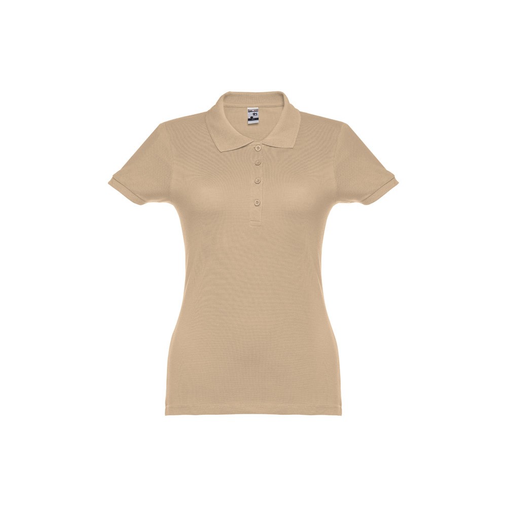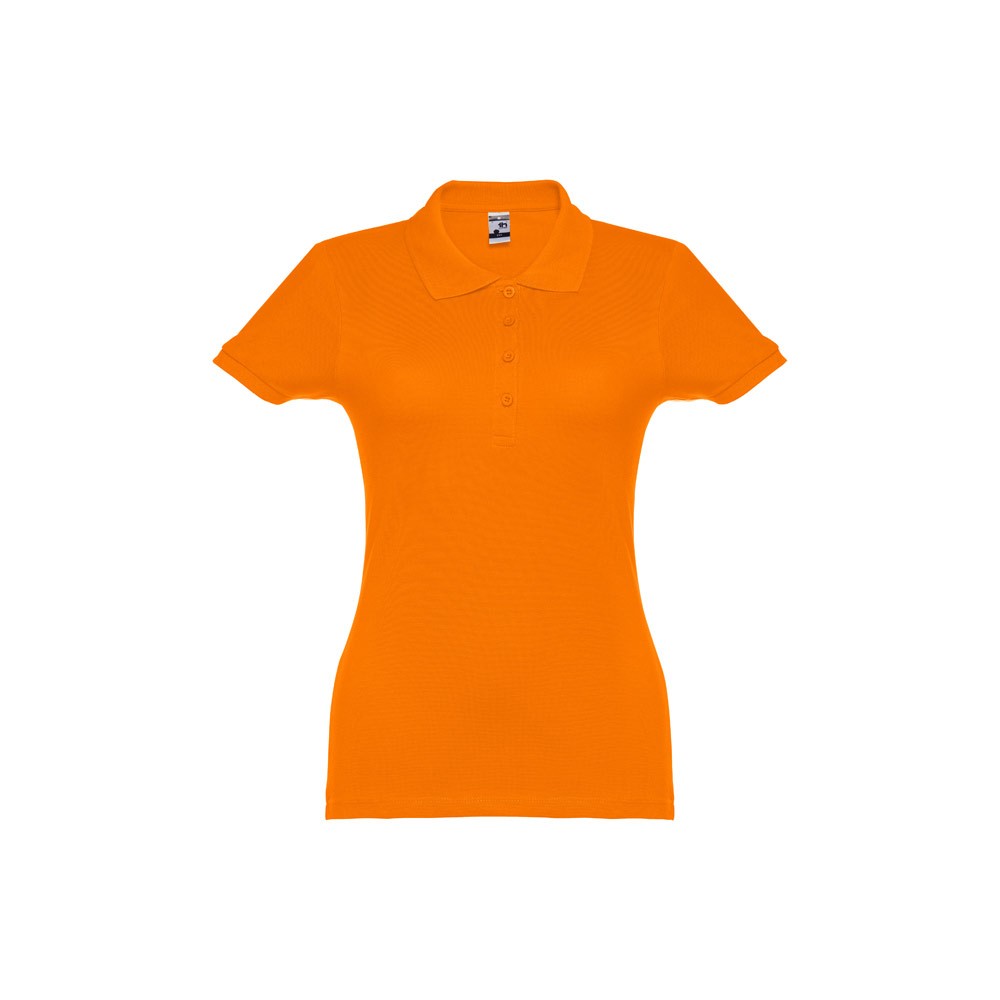 Polo ceinturé pour femme à manches courtes en maille piquée 100% coton (195 g/m²) cardé. Contient un col et des manches côtelés, le col est renforcé avec du ruban piqué. Sur le devant, à côté du col, il y a quatre boutons colorés (bouton de remplacement inséré dans la couture intérieure). Pièce coupée et cousue. Fabriqué au Bangladesh.