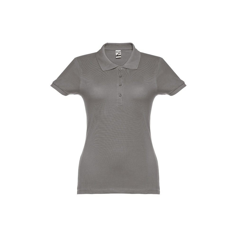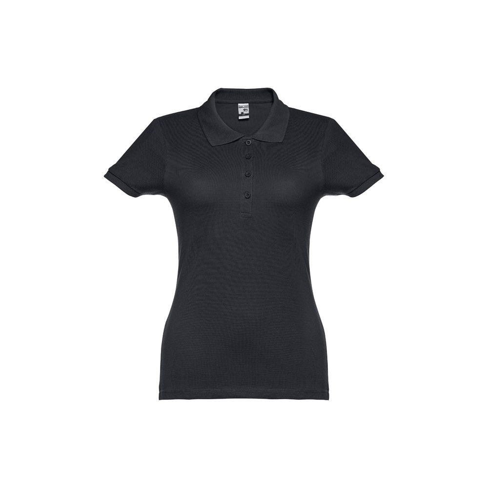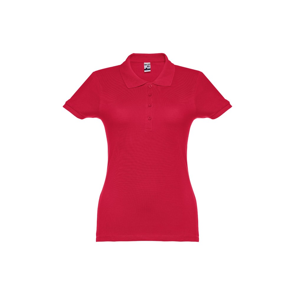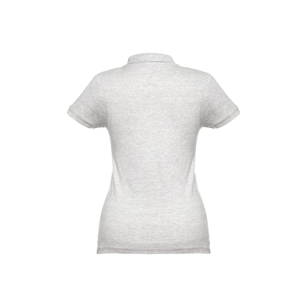 Polo ceinturé pour femme à manches courtes en maille piquée 100% coton (195 g/m²) cardé. Contient un col et des manches côtelés, le col est renforcé avec du ruban piqué. Sur le devant, à côté du col, il y a quatre boutons colorés (bouton de remplacement inséré dans la couture intérieure). Pièce coupée et cousue. Fabriqué au Bangladesh.