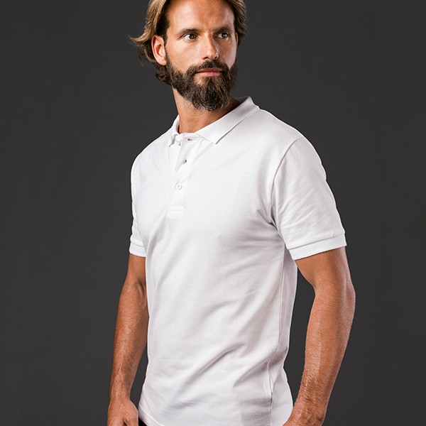Polo à manches courtes pour homme en maille piquée 100% coton (240 g/m²). Coupe classique avec col et manches côtelés et bande de renfort sur le col en maille piquée. Patte de boutonnage renforcée avec 3 boutons colorés (bouton de remplacement inséré dans la couture intérieure). Pièce coupée et cousue avec de petites ouvertures latérales en bas. Étiquette amovible visible. Fabriqué au Bangladesh.