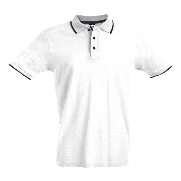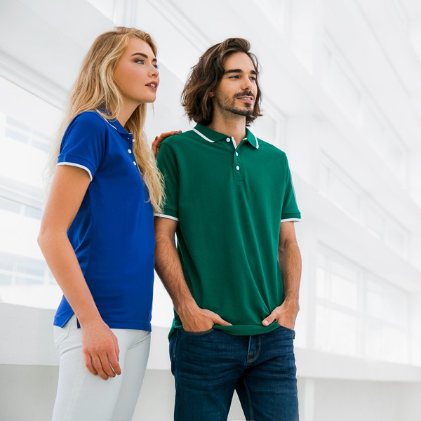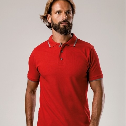 Polo pour homme à manches courtes bicolore en maille piquée 100% coton (210 g/m²). Contraste bicolore sur le col, les manches et la patte de boutonnage. Contient un col et des manches côtelés. Patte de boutonnage renforcée avec 3 boutons de couleur contrastée (bouton de remplacement inséré dans la couture intérieure). Pièce slim fit avec de petites ouvertures latérales au bas. Fabriqué au Bangladsh.
