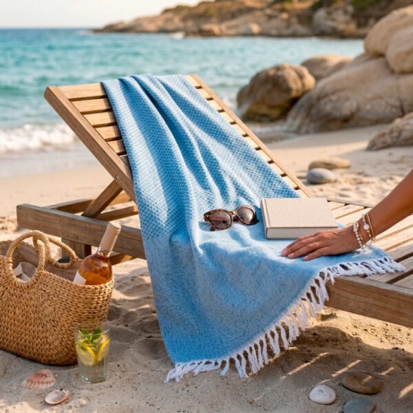 Fouta 70% coton recyclé – 30% polyester SEAQUAL – 300gr/m², livré roulée sous lien.
