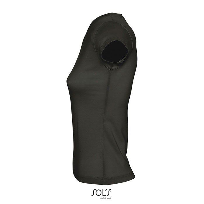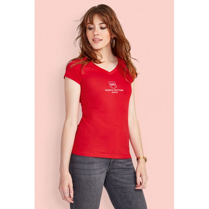 T-shirt 150g/m², La référence du T-shirt col V profond, en version féminine, Coupe ajustée, idéal pour le milieu de la mode., jersey 150, 100% coton semi-peigné Ringspun, Bande de propreté au col, Manches courtes, Coupe cintrée, Col V en bord côte élasthanne, Coupé cousu.