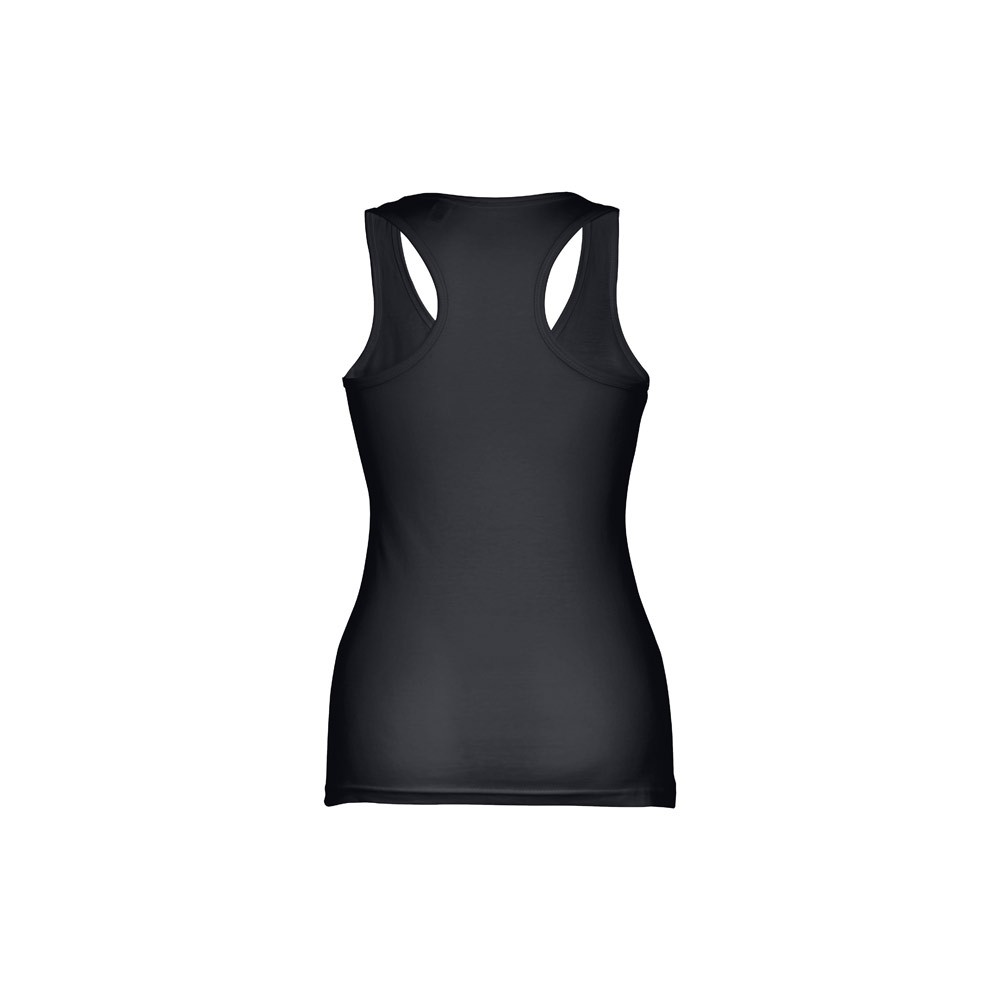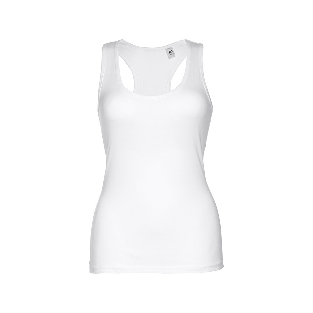 T-shirt sans manches pour femme en maille jersey 100% coton (160 g/m²) avec fil de coton cardé. Avec dos en » T » et col rond. Pièce coupée et cousue avec double surpiqûre en bas et finitions bords aux emmanchures et au col. Fabriqué au Bengladesh.