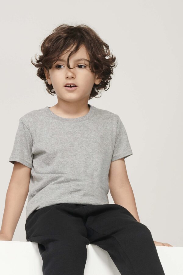 T-shirt enfant col rond ajusté jersey 150gr/m² 100% coton issu de l’agriculture biologique (85 % coton bio / 15 % viscose : 350 Gris chiné), apprêt naturel pour une qualité plus douce et lisse. Col avec bord côte 100% coton, col rond, bande de propreté au col, coupe ajustée et tubulaire.