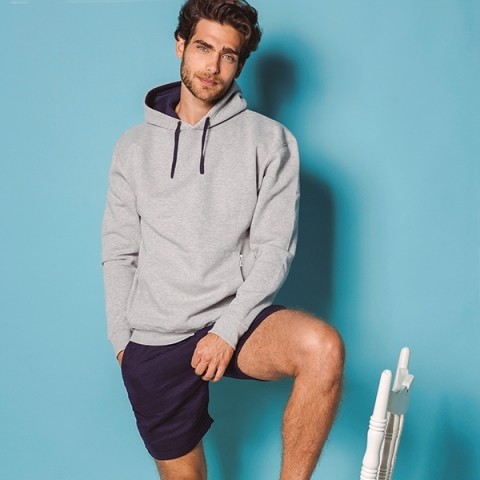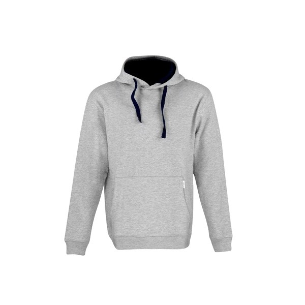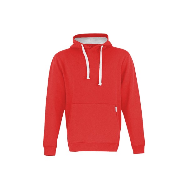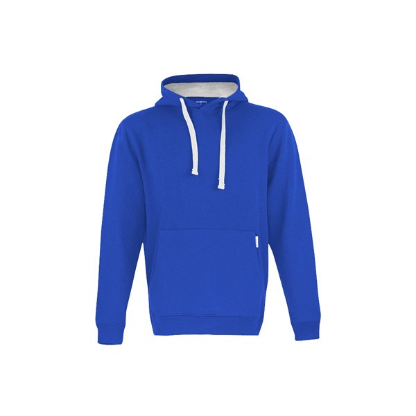 Sweatshirt (unisexe) en 50% coton et 50% polyester (320 g/m²) avec intérieur molleton. Poignets et ceinture côtelés 1×1, une poche marsupiale et une capuche avec des cordons de couleur contrastants. Fabriqué au Bangladesh.