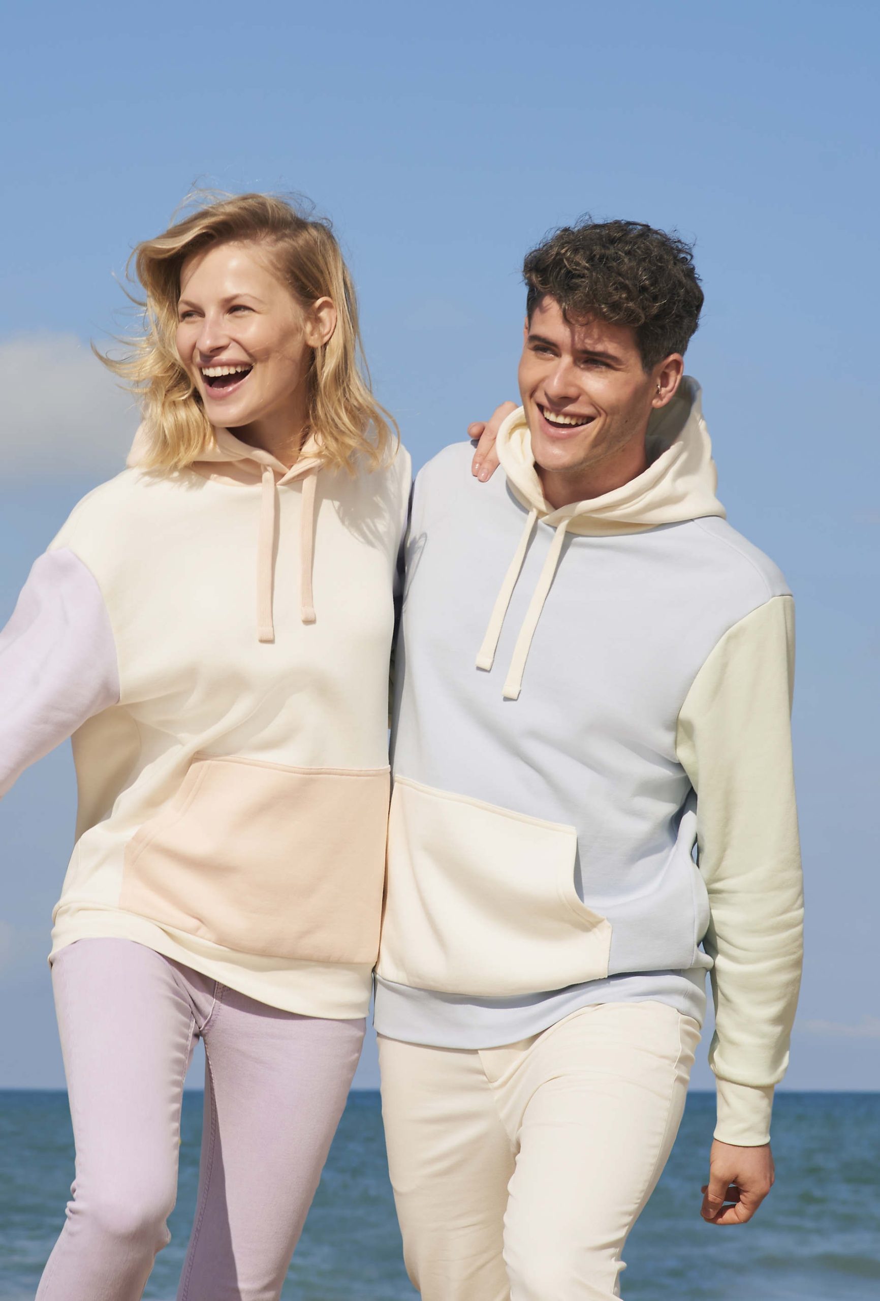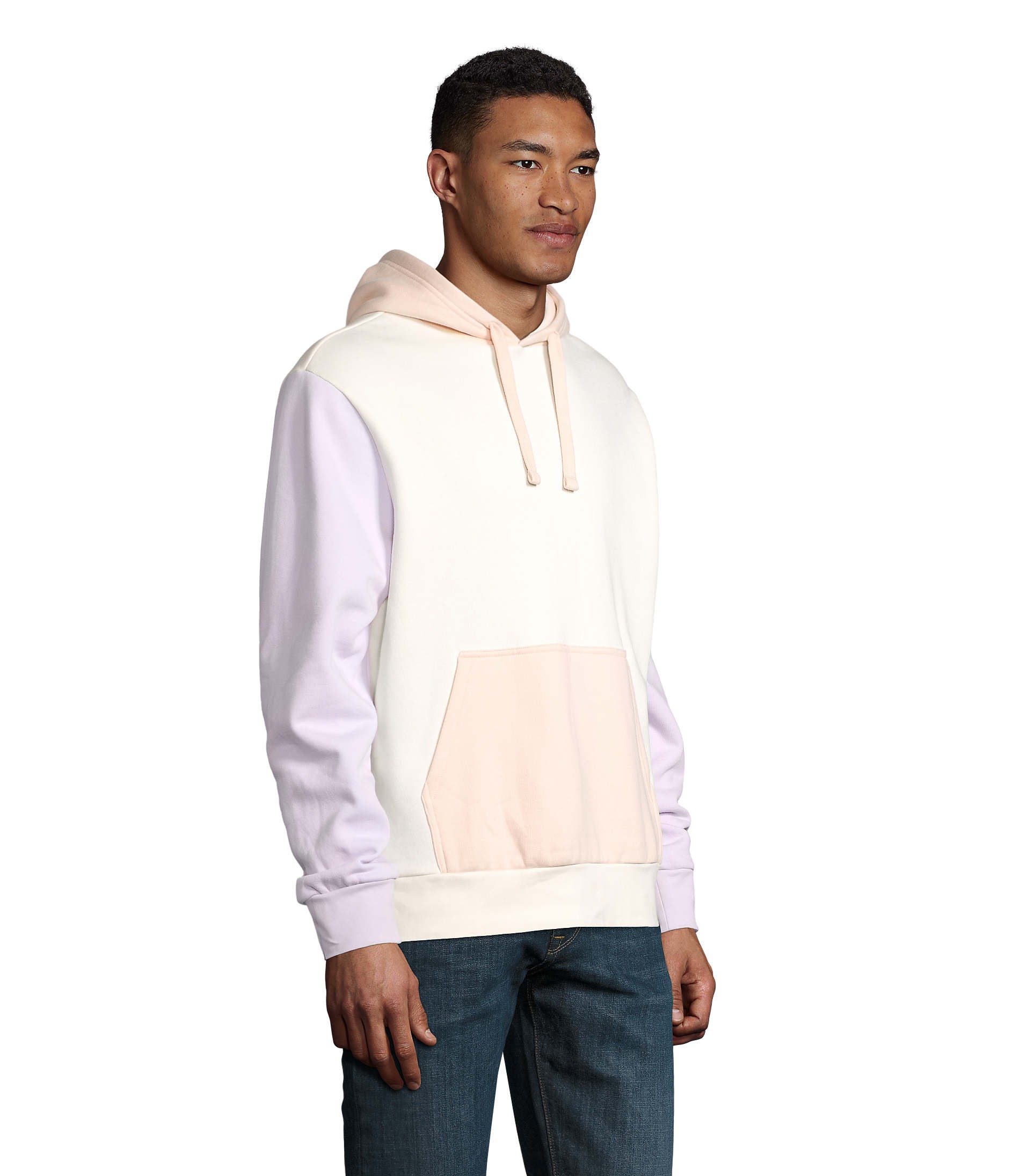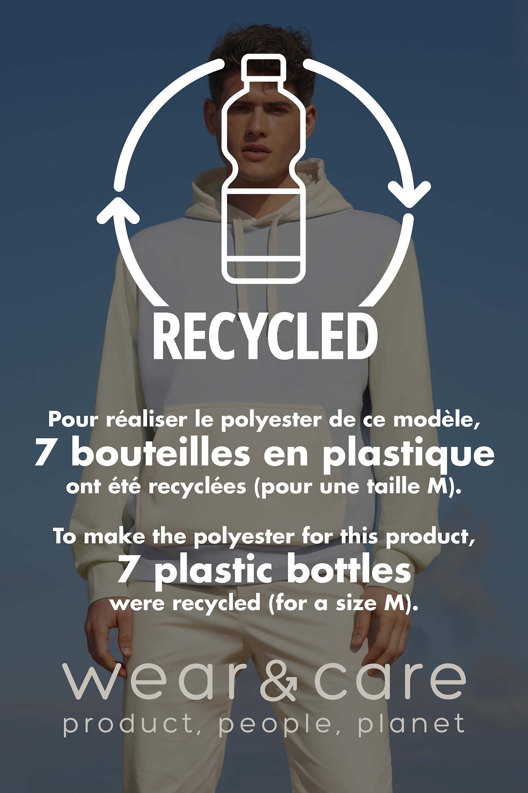 Molleton gratté 280gr/m² 80% coton peigné biologique – En cours de conversion – 20% polyester recyclé, 3 fils. Sweat-shirt tricolore, poche kangourou, coupé cousu et capuche doublée avec cordon de serrage. Poignets et bas en bord côte 1×1, demi-lune à l’intérieur du col et bande de propreté intérieur col.