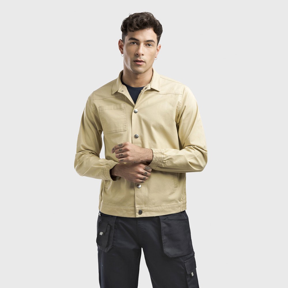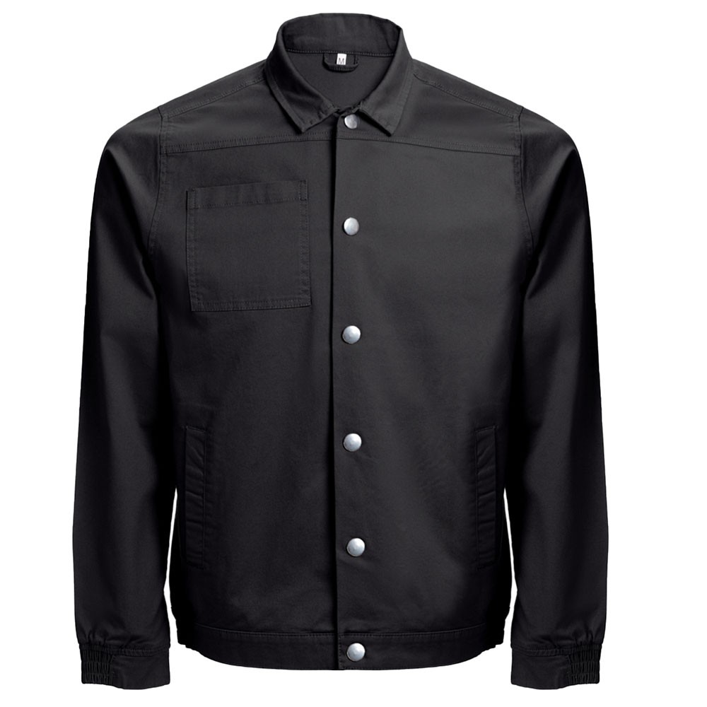Veste en coton 98% et élasthanne 2% (240 g/m²). De coupe moderne, elle comporte 2 pinces dans le dos et des élastiques aux poignets et à la taille. Le boutonnage se fait par boutons pression. Comprend 2 poches arrière et 1 poche poitrine. Fabriqué au Banglasdesh.